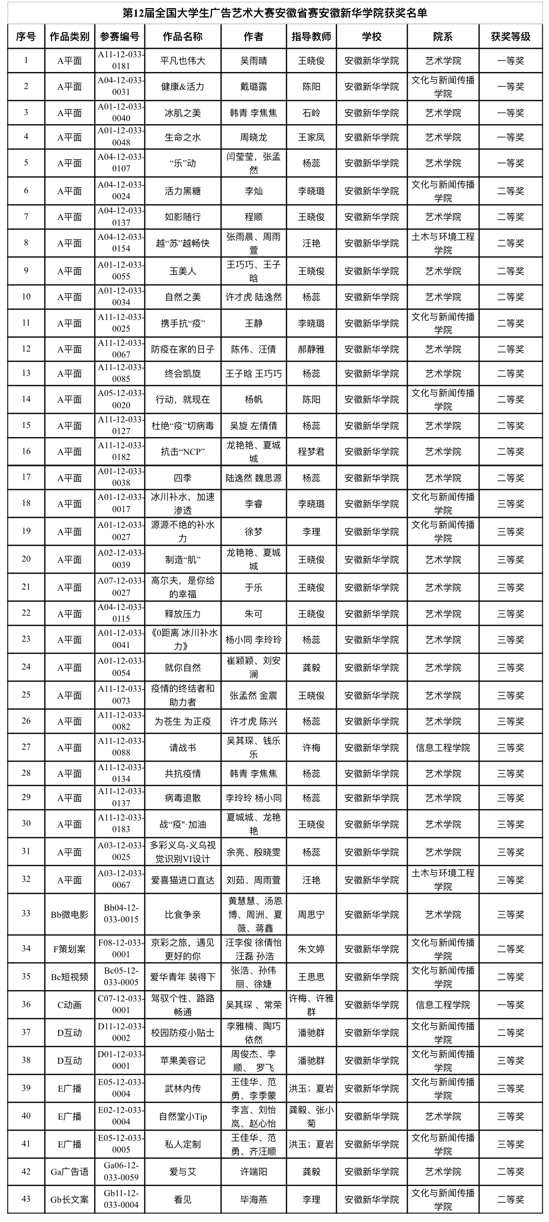 本网讯(通讯员:王晓俊)7月14日,2020年(第12届)全国大学生广告艺术大赛安徽赛区大赛结果公示。beat365官网学子共获得43个等级奖项,其中一等奖6项、二等奖17项、三等奖20项。