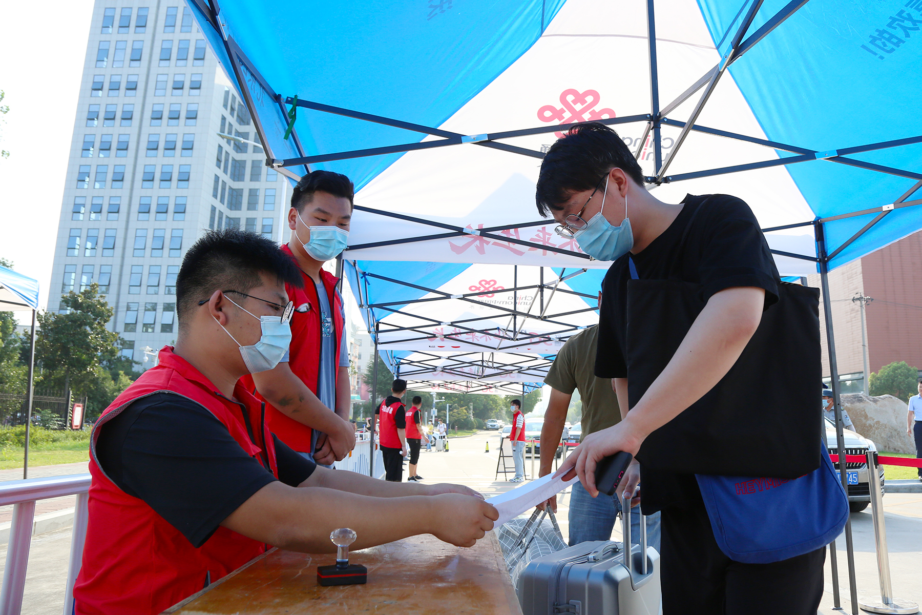 入校当天,beat365官网东门、西门开设了专用通道,工作人员和志愿者们清晨便已就位,迎接新生的到来。新生们经过专用通道,保持1.5米以上距离排队,依次检查安康码及健康承诺书,在完成体温检测、行李消毒流程后,有序进入校园。
