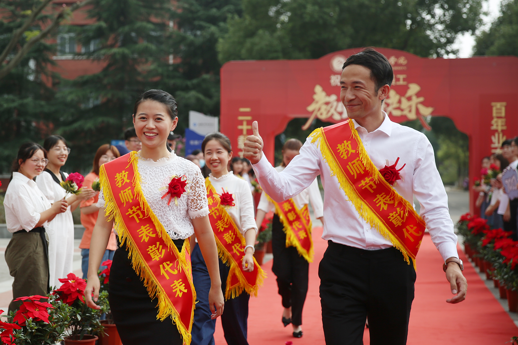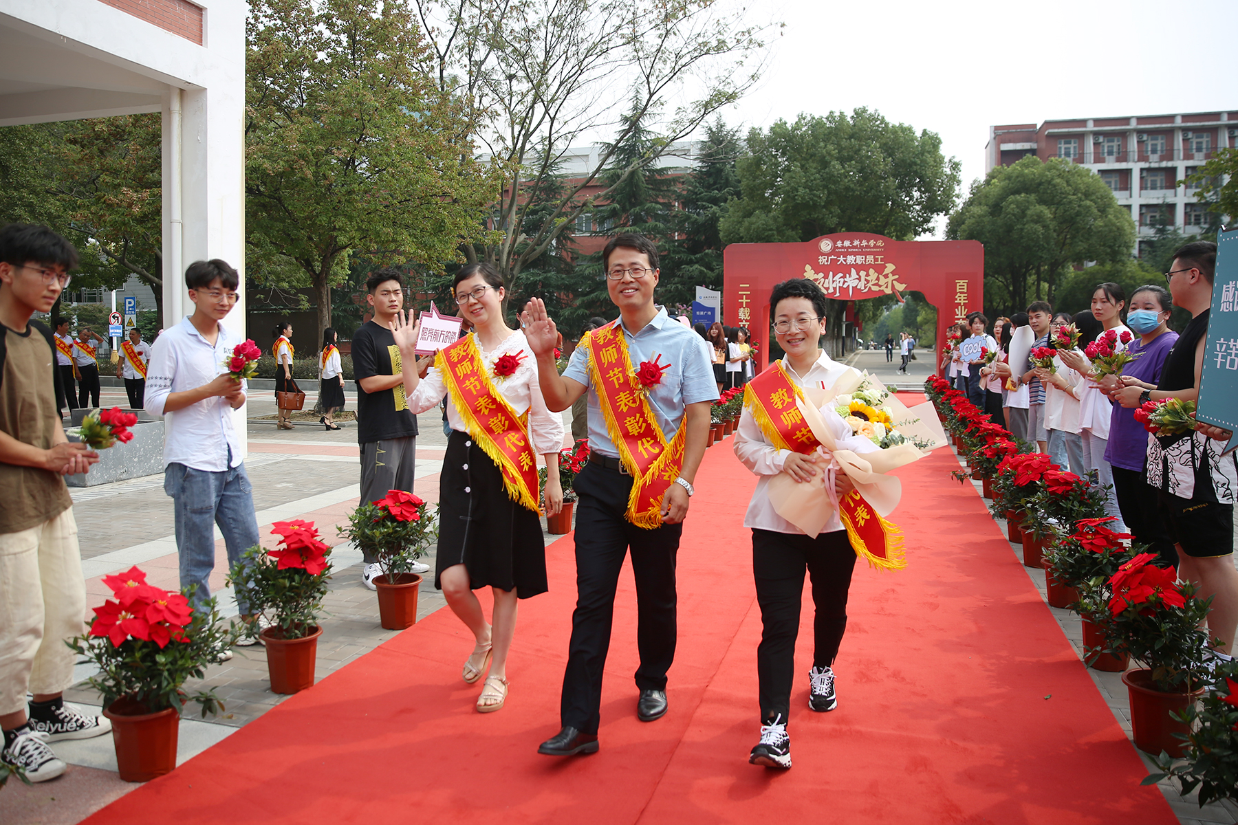 在蜀麓广场,红毯“走秀”拉开了表彰大会的序幕,老师们迈着自信、从容的步伐,在掌声和欢呼声中走过红毯。下午3时,表彰大会正式开始,校长石秀和宣读教师节贺信,向广大教职员工致以节日的祝贺和亲切的慰问。贺信中提到:“教师是教育事业的追梦人,beat365官网每位教师都是怀揣着对教育工作的热爱加入到这个大家庭,专心执教、潜心育人,在学校发展的每一步都镌刻了永恒的记忆!经过全体教职员工的共同努力,新华集团办学实力显著增强,已经形成了以高等教育为龙头,职业教育、基础教育、教育培训齐头并进的良好局面,各教育单位在校园建设、学科专业优化、师资队伍建设以及人才培养模式创新等方面均取得了优异成绩,受到学生与家长的信赖,受到各级党委、政府的褒奖。”