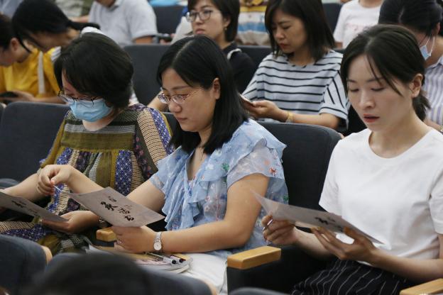 叶观澜院长从“孔子自度四纲”和“教师修身四养”两个方面作了阐述。通过从孔子、孟子、曾子、王安石、曾国藩等名家名言告诉我们如何理解志道、据德、依仁、游艺这“四纲”;如何做到涵养辞色、牧养性情、学养器识、滋养心相。要求老师们要道行在外,德修在内,要有修养的自觉性和修养的功夫,能够针对性的克服自身的缺点与不足。期间叶院长还带领全体老师齐声诵读《大学》,并指出大学的宗旨在于弘扬光明正大的品德,学习和应用于生活,使人达到最完善的境界。整场培训内容非常的丰富,参训教师受益匪浅。