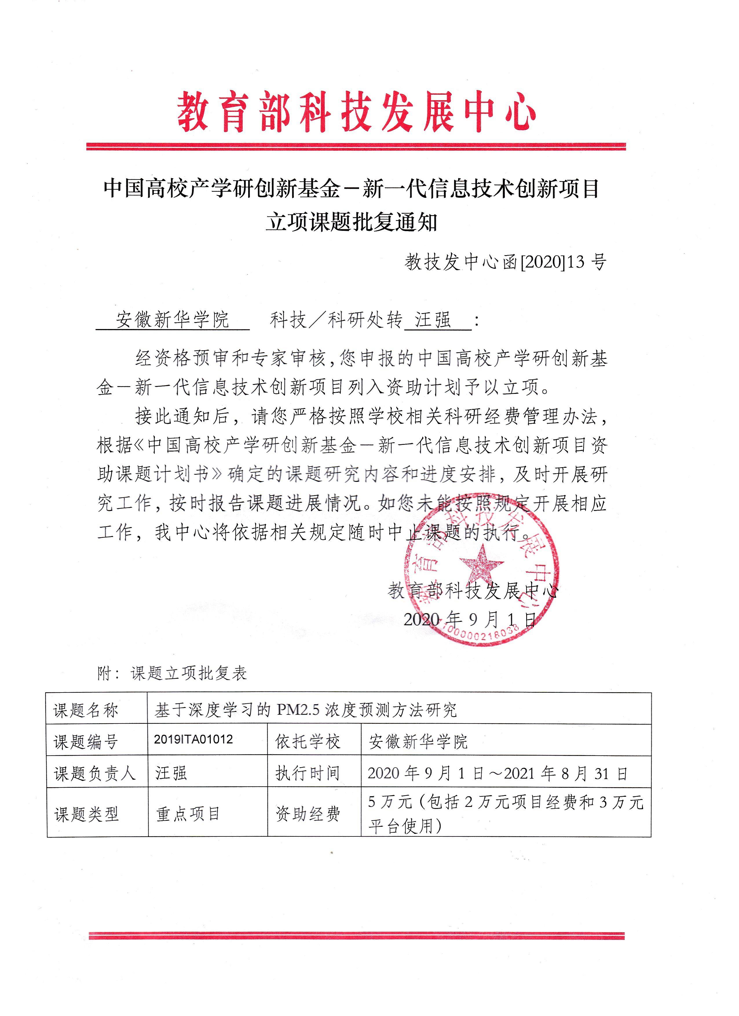 本网讯(通讯员:汪强)近日,由beat365官网信息工程学院汪强副教授主持申报的《基于深度学习的PM2.5浓度预测方法研究》课题,在中国高校产学研创新基金——新一代信息技术创新项目立项课题中获批“重点项目”立项。