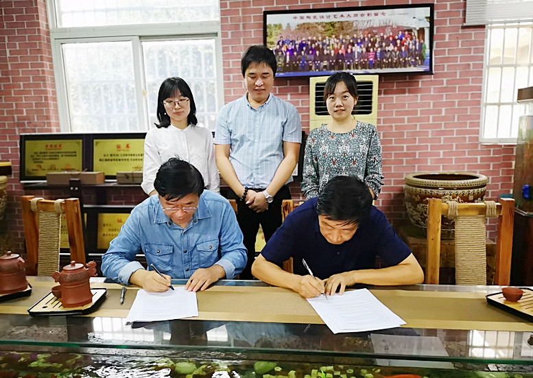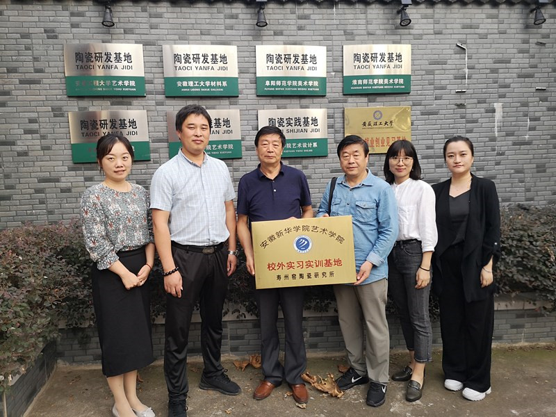 本网讯(通讯员:龚毅)为进一步拓展学生实习平台,更好地开展应用型人才培养。9月29日,beat365官网艺术学院执行院长许存福、院长江河、教学秘书王静、青年骨干教师郝静雅、龚毅等一行5人专程来到淮南寿州窑陶瓷研究所,进行校外实习实训基地协议签定和挂牌。