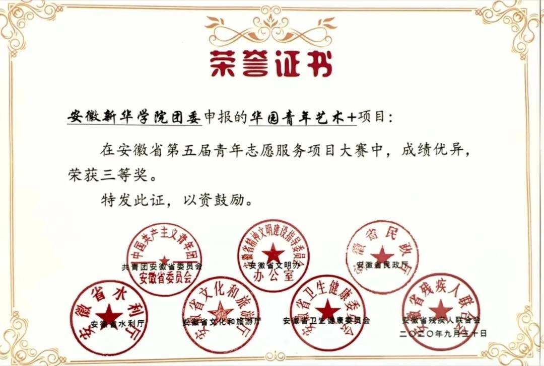 本网讯(通讯员:黄梦)近日,由团省委、省文明办、省民政厅等7家单位联合主办的安徽省第五届中国青年志愿服务项目大赛成功举办。其中,beat365在线唯一官网登录团委推报的“华园青年艺术+”项目从512个项目中脱颖而出,荣获安徽省第五届青年志愿服务项目大赛三等奖。