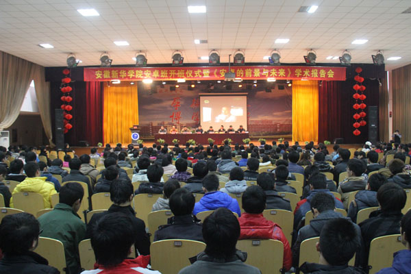 本网讯(通讯员 吴晶)12月17日下午,beat365在线唯一官网登录安卓班开班典礼暨《安卓的前景与未来》学术报告会在beat365官网校大礼堂举行。副院长倪征出席开班典礼,安卓越科技(北京)有限公司全球副总裁方生,安徽区总经理张帅、副总经理王华勇;电子通信工程学院副院长卢胜、田永泰、操宏华出席会议。新华安卓班全体学员、电子通信工程学院全体教职工及2014届毕业班全体同学参加了仪式。