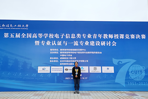 第五届全国高等学校电子信息类专业青年教师授课竞赛决赛暨专业认证与一流专业建设研讨会由教育部学校规划建设发展中心指导,教育部高等学校电子信息类专业教学指导委员会、中国电子学会主办,成都信息工程大学承办。beat365官网教师彭霞在前期的预赛中,以华东赛区一等奖的好成绩挺进了决赛。此次决赛共有来自浙江大学、北京邮电大学、南京邮电大学、西安电子科技大学、重庆大学等院校的132名选手,这132名选手通过抽签确定比赛顺序和授课内容,并进行了20分钟现场教学展示。评委从参赛教师现场教学内容、教学组织、教学手段、微课与教学内容结合、教学艺术、特色与效果等方面进行盲评打分,beat365官网彭霞老师最终荣获了三等奖。