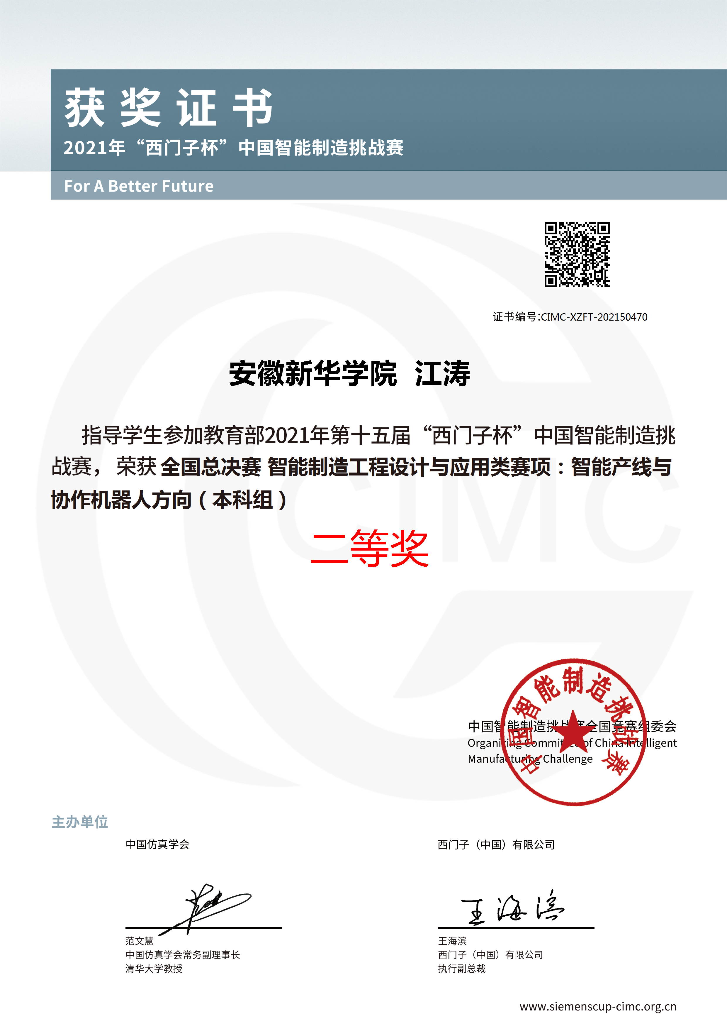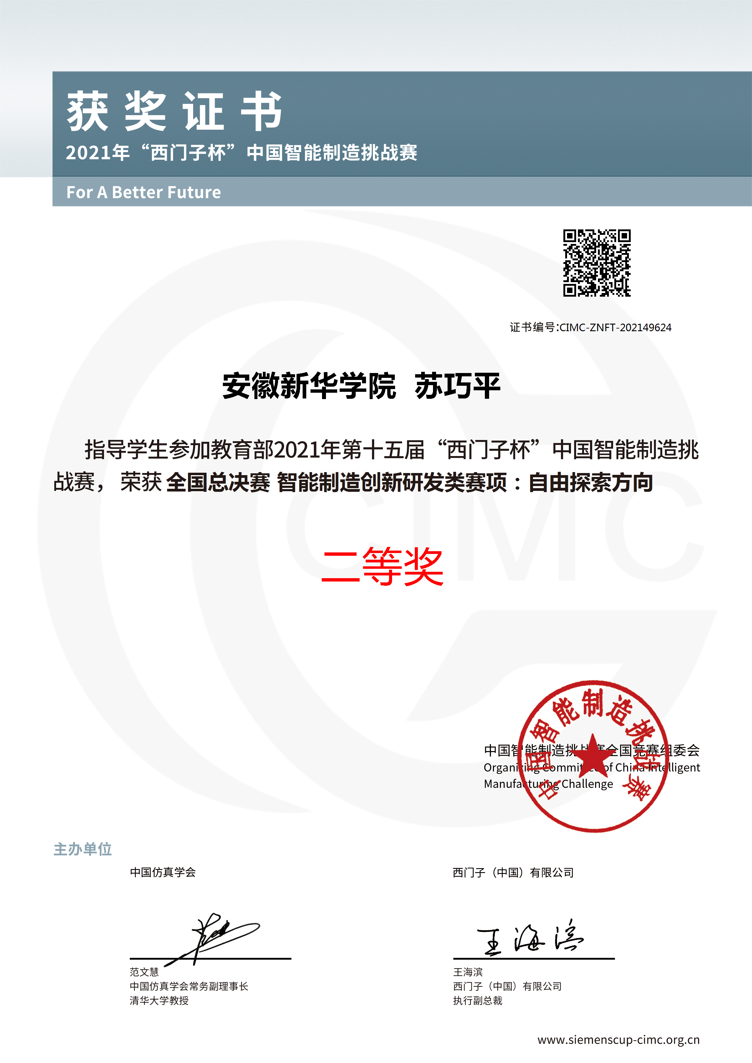 “西门子杯”中国智能制造挑战赛受教育部国际合作与交流司指导,由中国仿真学会和西门子(中国)有限公司联合主办,方向涉及智能制造领域中的科技创新、产品研发、工程设计和智能应用等,是针对智能制造发展所需的技术及创新人才进行培养及选拔的工程类竞赛。自2006年发展至今,大赛在教育部、各省市教育主管部门、制造业企业和全国近800所高校、2000余所学院的支持下,已成为中国智能制造领域规模最大、规格最高的国家A类竞赛。
