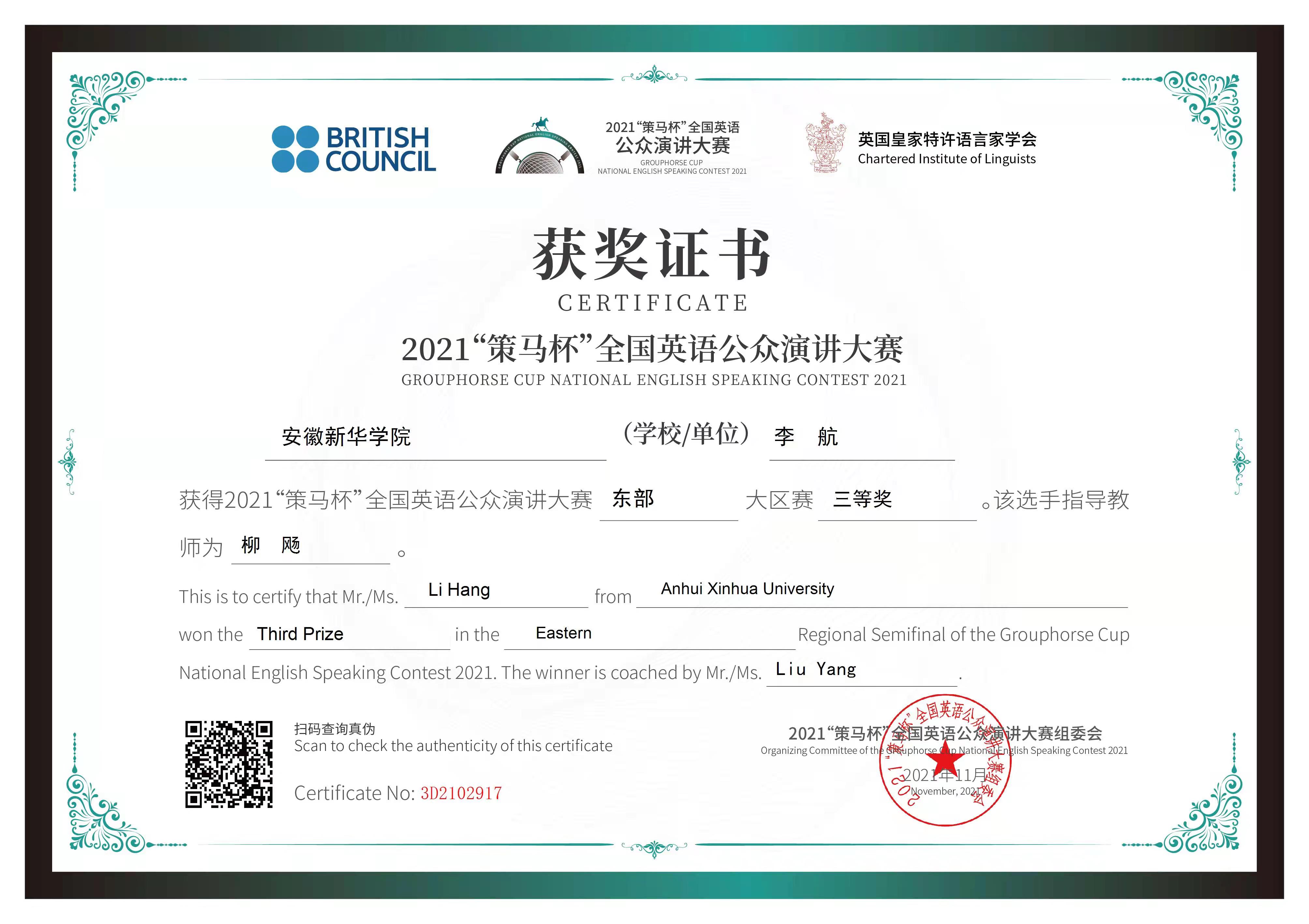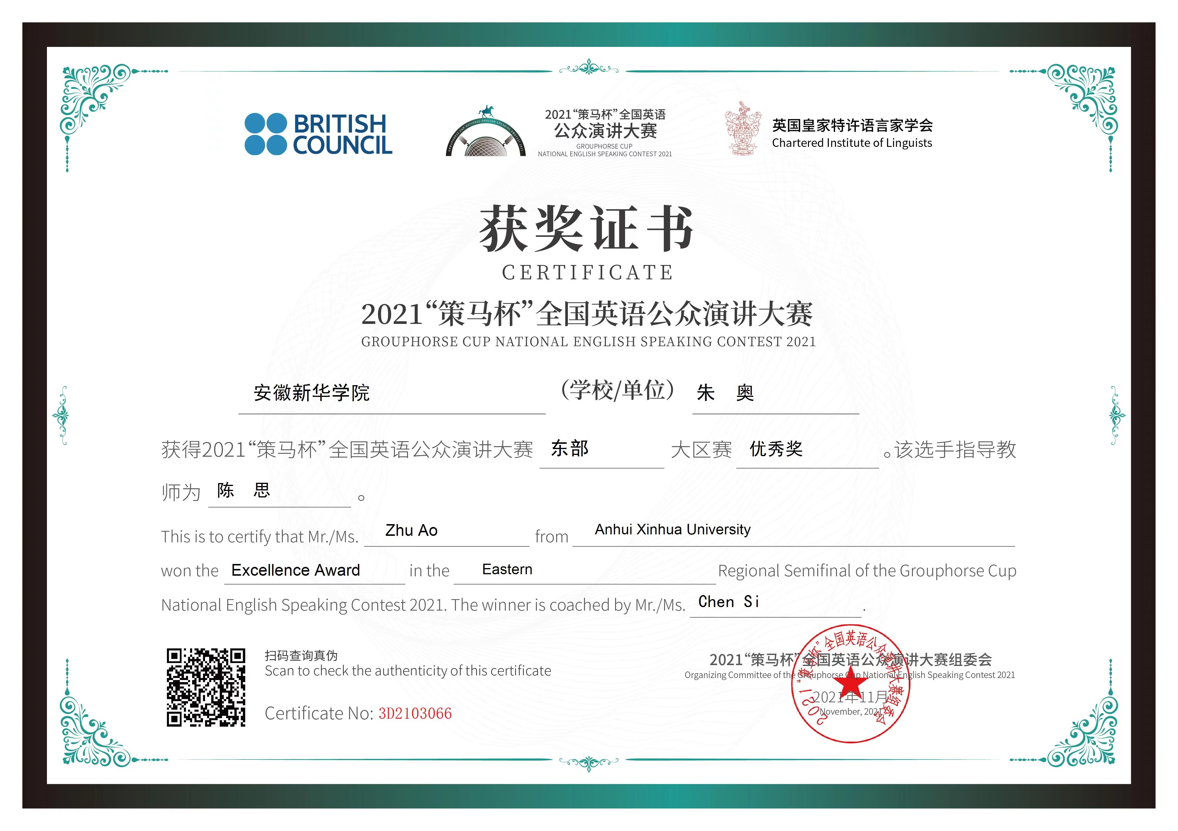 本网讯(通讯员:柳飏)11月28日,由英国大使馆文化教育处/英语文化教育协会官方支持、英国皇家特许语言家学会和北京策马翻译有限公司联合主办的2021“策马杯”全国英语公众演讲大赛东部大区赛隆重举行。beat365官网外国语学院积极组织专业教师进行全程指导,最终有四名选手在省赛中脱颖而出晋级东部大区赛。