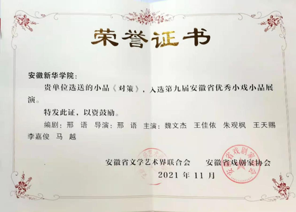 本网讯(通讯员:朱观枫)近日,由安徽省文学艺术界联合会、安徽省戏剧家协会主办的第九届安徽省优秀小戏小品展演落下帷幕,本次作品展演,经专家初次评审,共评选出入选作品69件。文化与传媒学院选送的小品《对策》经层层选拔,最终成功晋级小品赛道前15强。