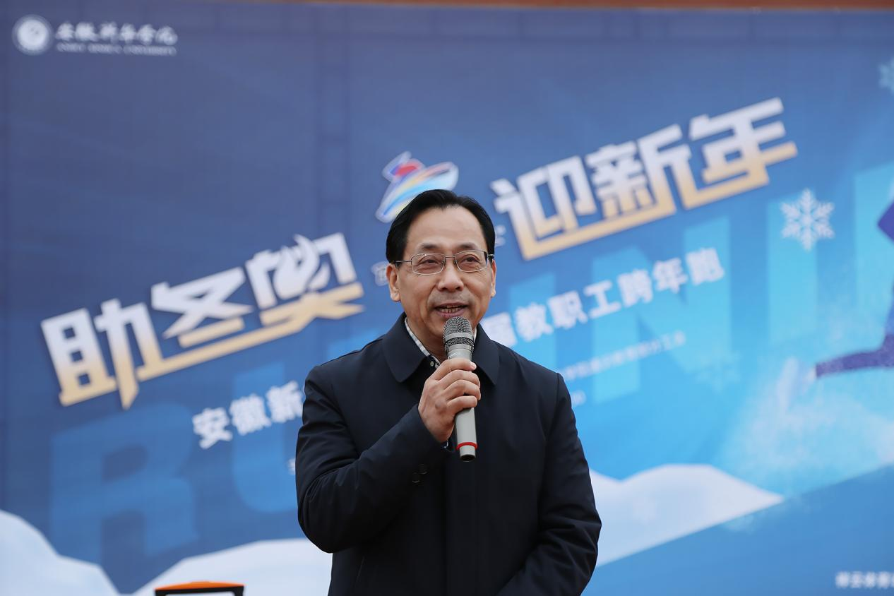 校党委书记邸建伟致辞,他向全体教职工致以良好的祝愿和新年的祝福,鼓励老师们在工作之余,多走向户外,到阳光下强健体魄、快乐工作、健康生活,以更好的心态、更高的热情、更大的效率投身到工作中。