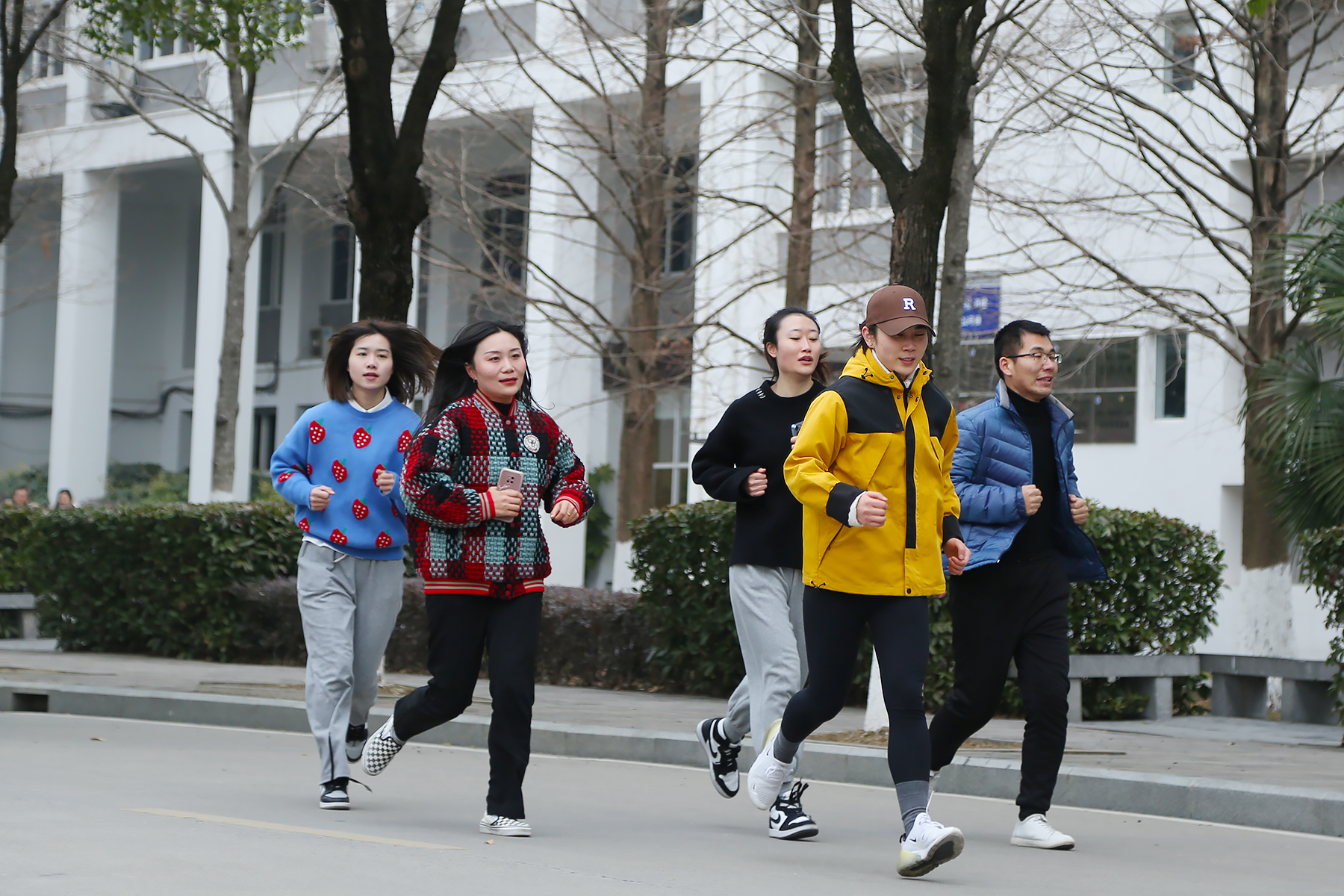 深冬的寒冷挡不住老师们似火的热情,在轻松欢快的热身操之后,跨年跑正式开始。参加活动的老师们意气风发、精神抖擞,在学生的加油助威中,沿着赛道有序出发。
