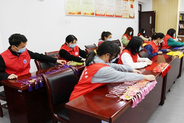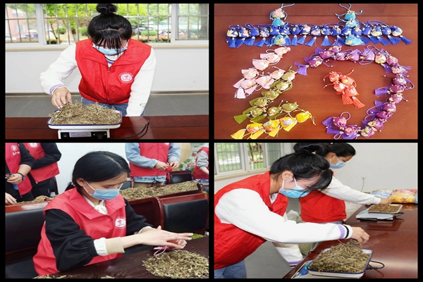 本网讯(通讯员:赵影 陈鹏) 近期,我国疫情多地频发,校园疫情防控形势复杂严峻,beat365官网实行封控管理以来,广大教职工和后勤人员坚守抗疫一线,牢牢守护师生的生命安全和身体健康。4月13日下午,药学院学子积极发挥药学专业特长,自制中药防疫香囊,送给坚守一线守护校园的最可爱的人。