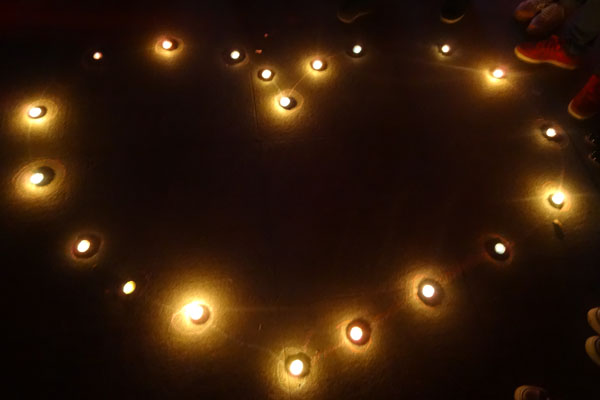 同学们手中摇晃的烛光,现场积极响应活动的同学,大屏幕上放映的祈福图片,空中飘扬的赈灾歌曲……每一幕都深深打动着在场的每一个人。活动开始前,主持人说:“面对突如其来的天灾,我们的祖国,我们五十六个民族的兄弟姐妹,没有旁观,没有沉默。今天,虽然我们不能奔赴地震灾区的现场,但是我们可以用自己的方式和相同的爱为灾区人民祈福”。