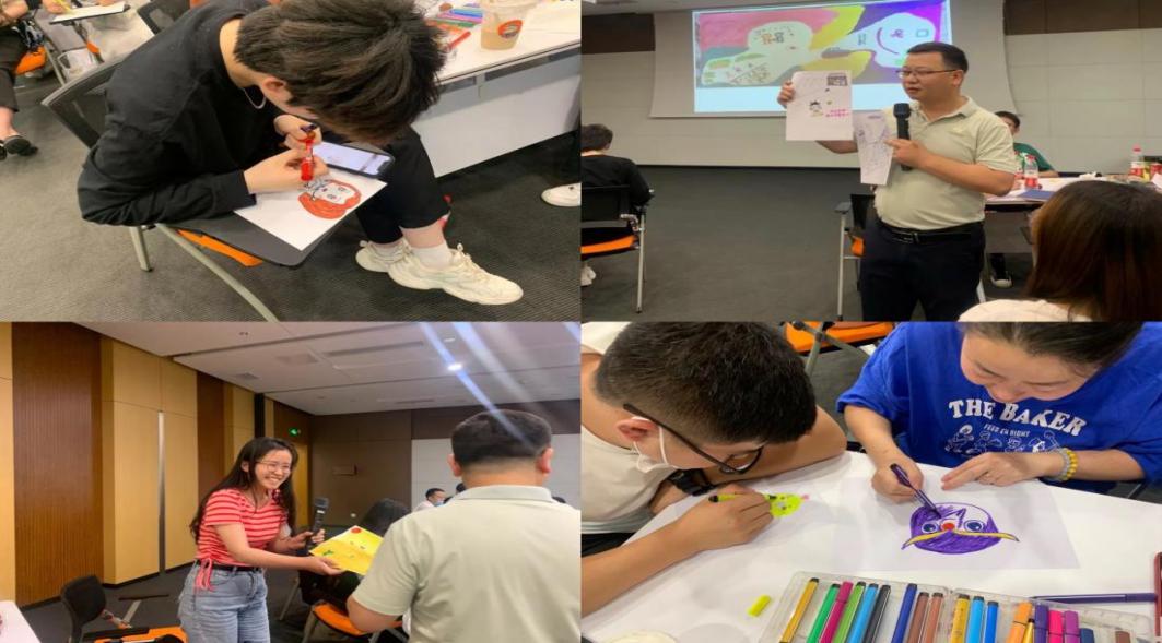 当日下午,防疫与情绪表达主题艺术团体辅导活动由林斗秀老师主持,以音乐、绘画创作分析和团体交流为主要形式,伴随着一段柔美的轻音乐,林斗秀带领老师们通过深呼吸的方式来放松自己,渐渐融入到活动氛围中,在活动体验环节,老师们沉浸在绘画之中深化心灵感受,将内心的体验与感受付诸纸笔,在不知不觉中获得了压力的释放,画作完成后,每一位老师都分享了自己在绘画过程中的想法和感受,交流如何在繁忙的工作中获得内心的平静,辅导员老师们纷纷表示接近一个半小时的互动、交流、分享,不仅缓解了工作压力,同时也掌握了一些积极调试自我情绪的方法,今后也会借鉴运用于学生工作中去。