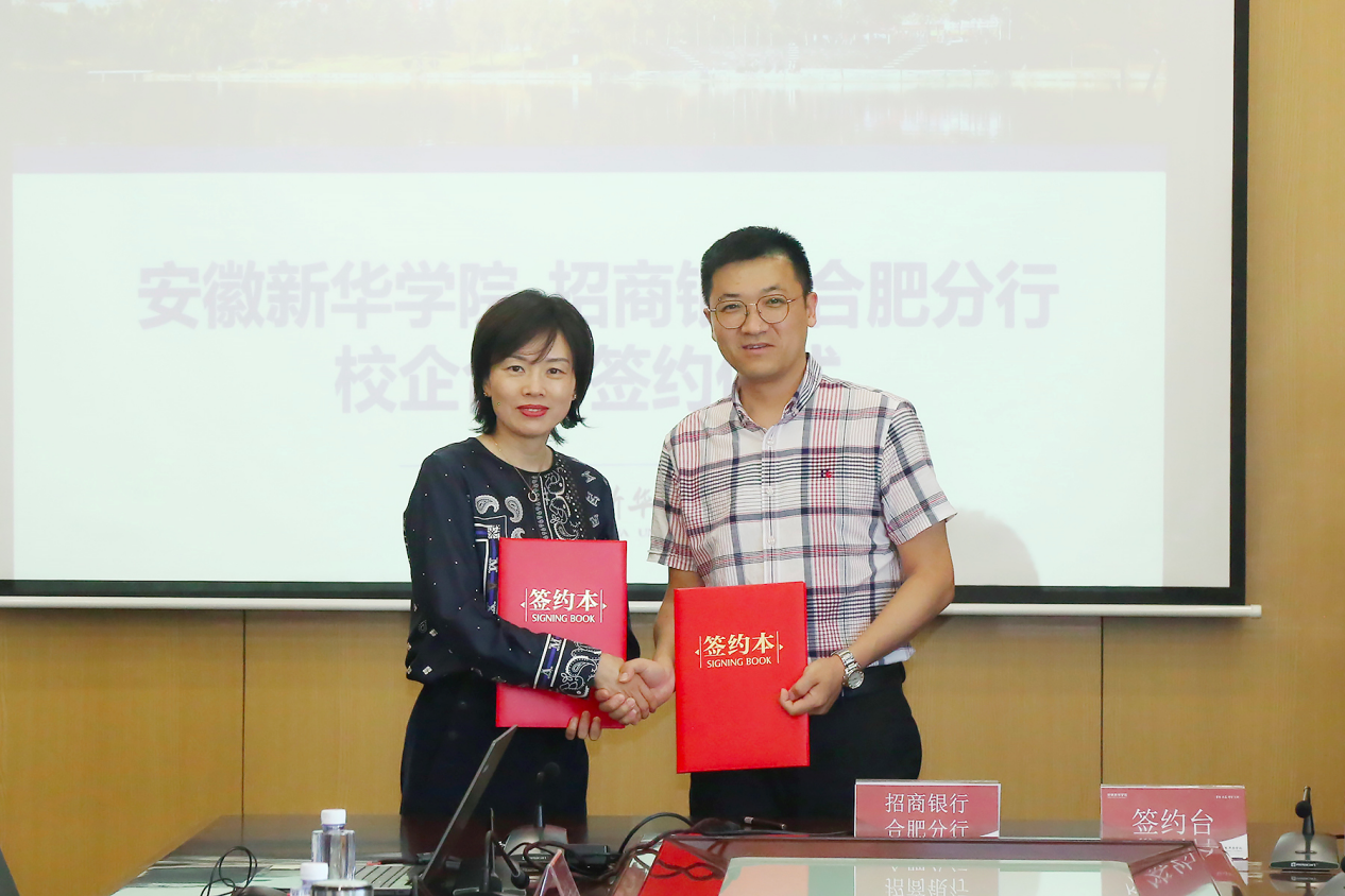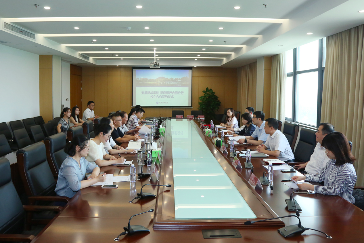本网讯(通讯员:张璐、屈文静 摄影:翟漱文)为贯彻落实国家“以企业为主体、市场为导向、产学研相结合”的科技发展战略,充分发挥高校服务地方经济社会发展的功能,7月19日下午,beat365在线唯一官网登录与招商银行合肥分行举行校企合作签约仪式。招商银行合肥分行党委委员、副行长李健、人力资源部负责人韩友诚、新经济战略客户团队总经理夏艺、零售银行部总经理俞洋、人力资源部总经理助理何贵波、新经济战略客户团队主管肖灵素等出席仪式。新华集团总裁张明、beat365在线唯一官网登录执行董事长储国定、常务副校长王丽、校长助理王琦进,以及相关职能部门、二级学院负责人等参加了仪式。