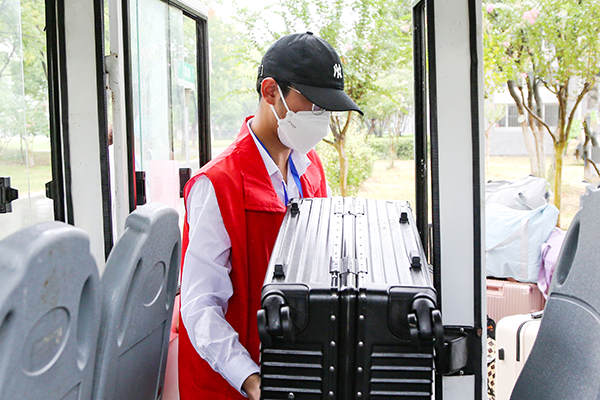 为了让家长们“放手又放心”,解决新生的行李搬运难题,今年,学校组织了1500余名学生志愿者,在汽车站、火车站设立接待点迎接新生。身着红色马甲的志愿者们更是组成了迎新志愿服务队穿梭在校园的每个角落,并协助学校后勤部门组织接送车,帮助新生搬运行李。