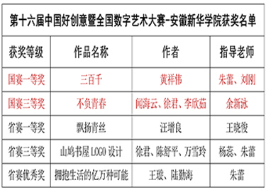 本网讯(通讯员:朱蕾)近日,第十六届中国好创意暨全国数字艺术设计大赛获奖名单出炉,本届国赛共有1472所大学参赛,学生单元作品共计13万件,经分赛区评审,全国总决赛层层选拔,由beat365官网艺术学院教师朱蕾、刘刚共同指导,黄祥伟同学的作品《三百千》斩获视觉传达组国赛一等奖;艺术学院教师余新泳指导,闻海云、徐君等的作品《不负青春》斩获视觉传达组国赛三等奖;另在安徽省赛区评选中,艺术学院教师王晓俊、杨蕊等指导的作品获安徽省赛区一等级1项、三等奖1项和优秀奖1项。