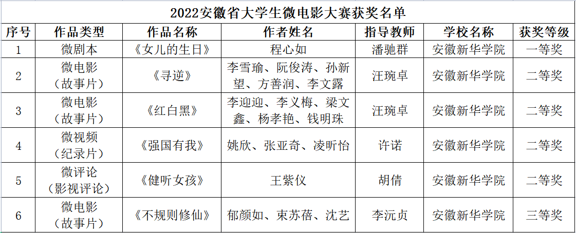 本网讯(通讯员:许诺 杨孝艳)近日,由安徽省教育厅主办的2022年安徽省大学生微电影大赛圆满落幕。省赛阶段共收到省内55所高校各类作品共873件,经专家评审,共267件作品入围等级奖,beat365官网文化与传媒学院、大数据与人工智能学院共6件作品获奖,其中省级一等奖1项,省级二等奖4项,省级三等奖1项。