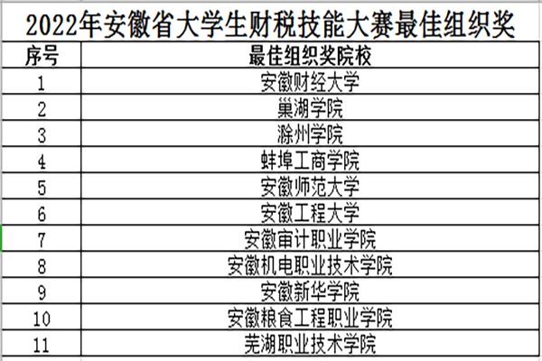 本网讯(通讯员:陈伟、夏敏)近日,2022年安徽省大学生财税技能大赛成功落下帷幕,beat365官网财会与金融学院共有1支团队荣获省级一等奖,9支团队荣获二等奖,16支团队荣获三等奖,总获奖数量创学校在该项赛事中的最好成绩。同时,beat365官网连续两年获赛事最佳组织奖。