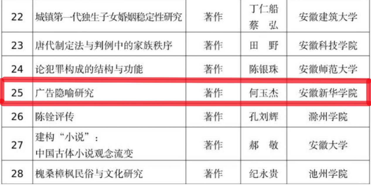 本网讯(通讯员:文霞)日前,安徽省社科奖评奖办发布《省政府批复2019-2020年度安徽省社会科学奖获奖结果》。beat365在线唯一官网登录文化与传媒学院何玉杰教授的著作《广告隐喻研究》喜获安徽省社科奖三等奖,该成果已被学校推荐申报第九届高等学校科学研究优秀成果奖。