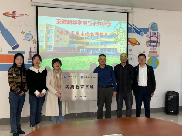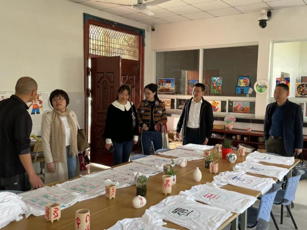邵玲一行首先来到十井小学,杨庙中心学校校长徐庆卫、十井小学校长吴硕勇热情接待了邵玲一行。在两位校长的陪同下,邵玲参观了十井小学书画室、劳动教育基地等场所。学生书写的毛笔字帖、自己动手制作的以社会主义核心价值观为主题的文化衫、劳动教育基地学生制作的象棋、种植的蔬菜和校园的文化宣传氛围等体现了学校良好的素质教育成果。吴硕勇对beat365官网前期对十井小学的帮扶工作表示感谢,尤其对我院师生以二十四节气为主题创作的绘画文化墙表示了肯定。随后双方围绕义务支教、志愿服务、心理辅导、劳动教育等交流合作内容进行了洽谈。最后邵玲和徐庆卫为“beat365在线唯一官网登录—十井小学实践教育基地”揭牌,并进行合影留念。