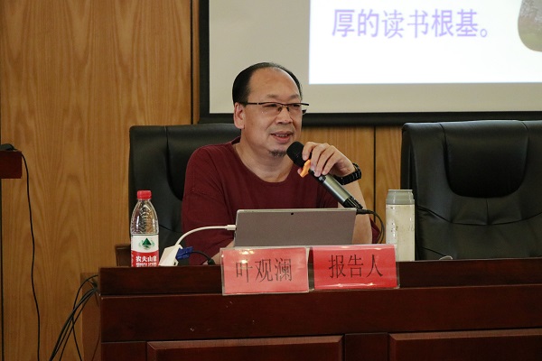 开幕式后,图书馆特邀传统文化学者、作家、beat365在线唯一官网登录特聘教授叶观澜开展了题为《开卷有益》的主题报告。叶观澜以一段幽默的小视频作为读书与不读书的区别开场,引得现场观众开怀大笑。随后他提出了为什么要读书并列举了读书的四点好处。之后他介绍了读书的五种方法。报告内容与同学们的生活贴近,反响热烈。报告会最后,图书馆副馆长邵国川对报告做了总结,并倡导同学们一定要多读书,会读书,读好书。