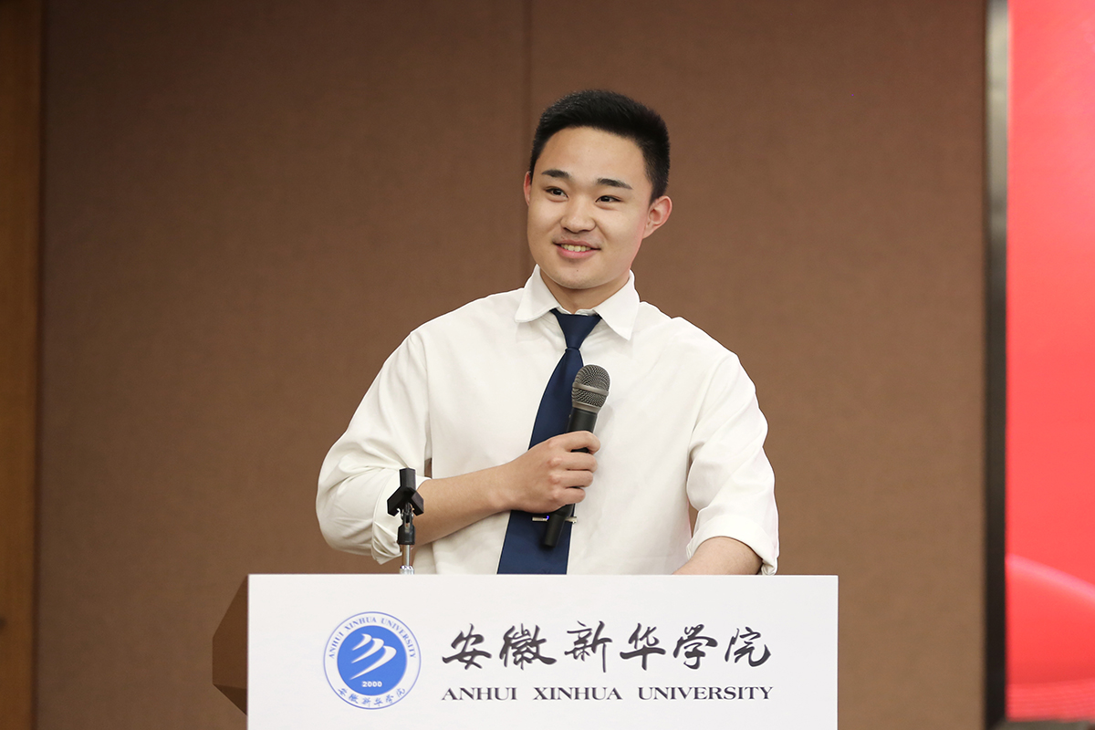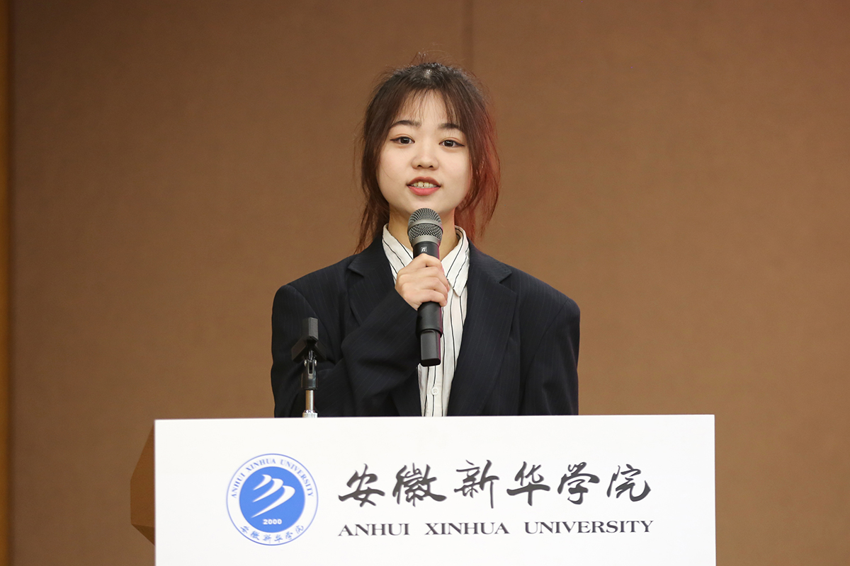 “去年九月,盛夏骄阳,我初入新华园,满怀着对大学生活的向往,怀揣着对知识的渴望,我步入了这所美丽的学校。这里有施展青春风采的体育场,有绿树成荫的秋实路,有碧波荡漾的如琴湖、有天南地北的美食……”学生代表电子工程学院/智能制造学院大一学子薛妍发言。“在校期间,我荣获国家、省市级各类比赛奖项累计20余项,连续两届获安徽省互联网+大赛省级金奖,并荣获安徽省‘十佳、百优’大学生候选人、安徽省优秀毕业生等称号。这一切荣誉的获得,都离不开新华园老师们的殷切指导和同学们的大力支持。”学生代表财会与金融学院2019级学子郭圆分享了他在新华园四年的所学所获。