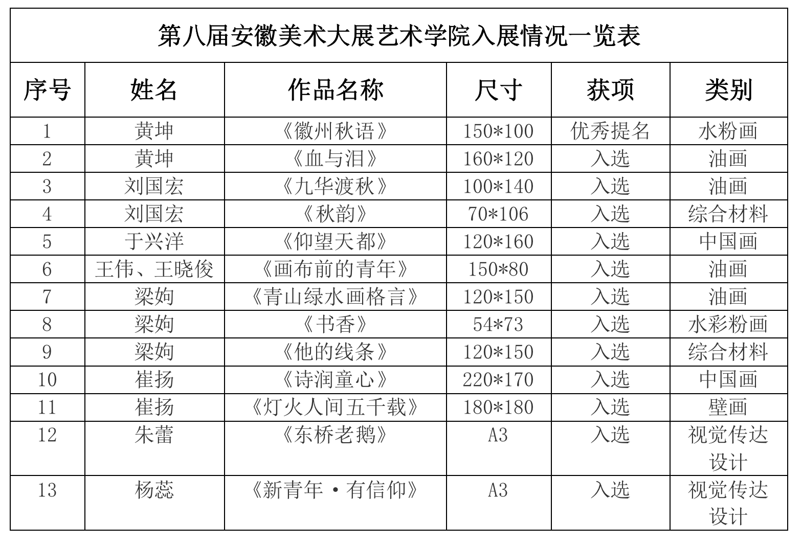艺术学院教师作品在国家级展览、安徽省最高规格的美展中展出,不仅是学院教师艺术创作水平的真实展现,同时也对激励艺术学院学科建设、内涵发展起到了积极的推动作用。