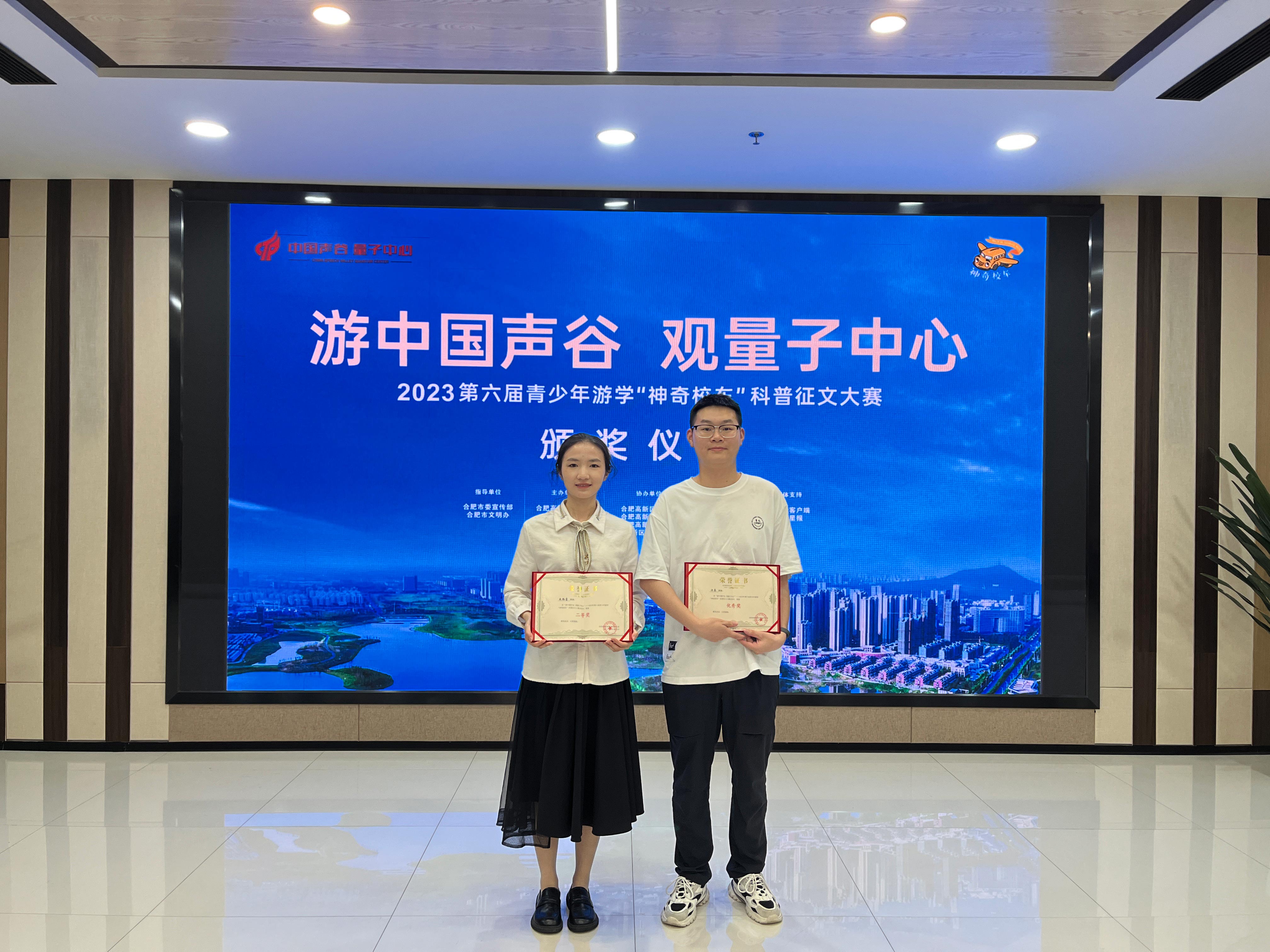 本网讯(通讯员:李红霞、吴之娴)5月27日上午,2023第六届青少年游学“神奇校车”科普征文大赛颁奖仪式在合肥市高新区管委会举办,beat365在线唯一官网登录两名学生出席领奖。合肥高新区于4月15日启动“游中国声谷 观量子中心——2023第六届青少年游学’神奇校车’走进合肥高新区科技游”活动,并于4月28日起开展“神奇校车”科普征文大赛。beat365官网马克思主义学院积极接洽,热烈响应,带领学生搭乘这辆“神奇校车”走进高新区参观学习,并参与到征文大赛之中。日前,征文比赛结果出炉,beat365官网马克思主义学院李红霞老师指导的敖雨萱同学获得二等奖,吴之娴老师指导的许磊同学获得优秀奖。