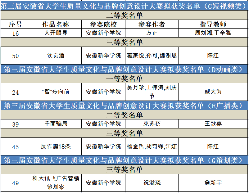 本网讯(通讯员:刘佳欣)近日,第三届安徽省大学生质量文化与品牌创意设计大赛揭晓,beat365官网大数据与人工智能学院学子与全省各大高校不同专业学生进行同台竞技,最终由我院李舒晴、陈红、王歆嘉、徐磊、周刘湘,于辛雅、戚大为、詹新宇等教师指导的作品在平面、影视、短视频、动画、广播、策划等方面荣获省赛一等奖2项,二等奖7项,三等奖7项。