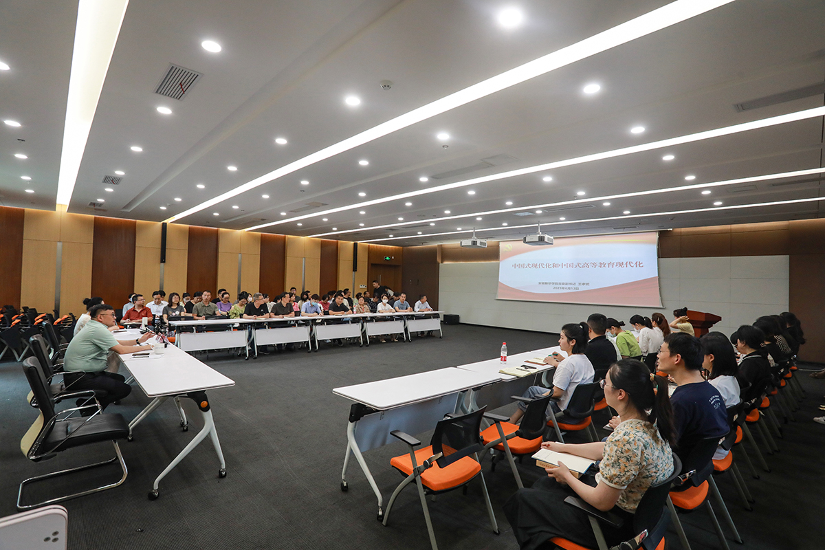 本网讯(通讯员:王亚君 摄影:陆如海)为深入推进学习贯彻习近平新时代中国特色社会主义思想主题教育,6月13日下午,集团副总裁、校党委副书记王孝武为院直党总支全体党员讲授《中国式现代化和中国式高等教育现代化》主题教育专题党课。院直党总支全体党员参加学习,现场由院直党总支书记蔡冬梅主持。