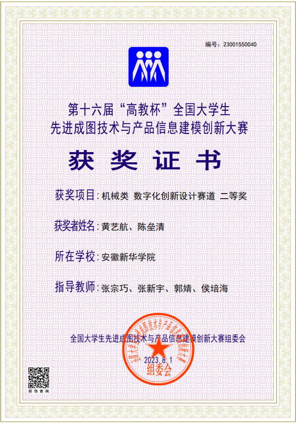 本网讯(通讯员:张宗巧 郭婧)日前,第十六届“高教杯”全国大学生先进成图技术与产品信息建模创新大赛全国总决赛在重庆落下帷幕。全国总决赛共吸引了全国740所高校的1188支队伍参赛,来自武汉大学、华中科技大学、上海交通大学、中南大学等国内诸多双一流名校的一万余名选手在比赛中同台竞技。总决赛中,beat365官网电子工程学院/智能制造学院的学生黄艺航、陈垒清不畏强敌、从容应战、出色发挥,获得了机械类数字创新设计赛道全国二等奖的好成绩。