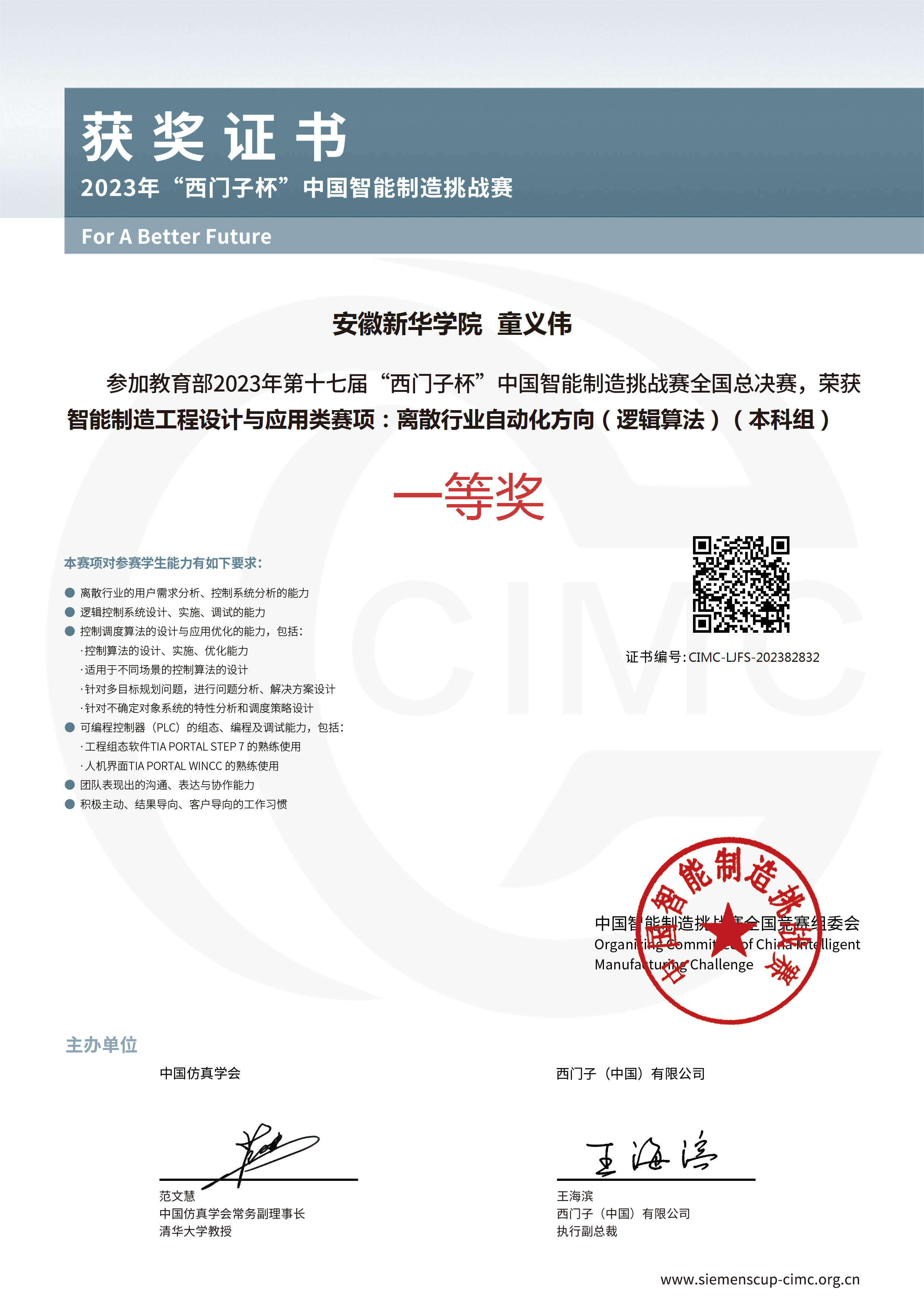 “西门子杯”中国智能制造挑战赛是在教育部与西门子公司战略合作框架下的一项国家级A类赛事。自2006年发展至今,已成为中国智能制造领域规模最大、规格最高的国家A类竞赛。