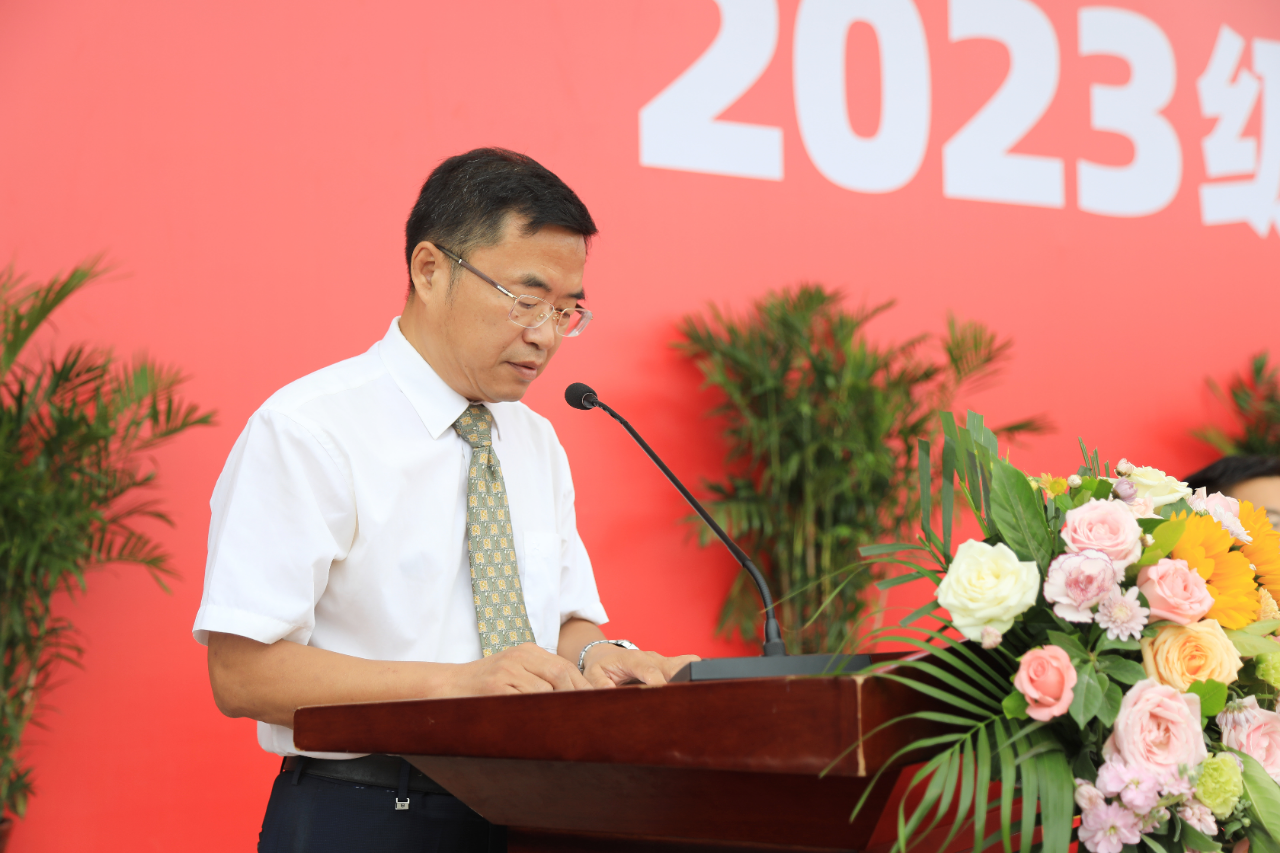 赵良庆校长代表学校向全体新同学表示热烈的欢迎,他以《奋楫笃行 启航未来》为题,寄语新生。他对同学们提出三点希望,一是要以强国复兴之责实现学有所为,争做有志气的青年学子;要以好奇探索之心实现学有所思,争做有锐气的青年学子;要以会学善学之能实现学有所获,争做有底气的青年学子。