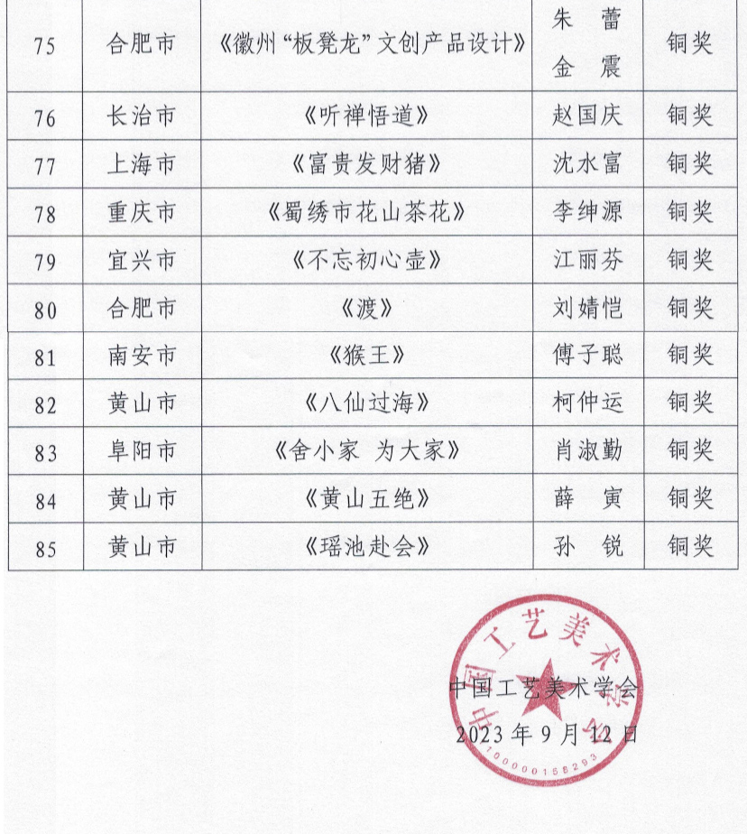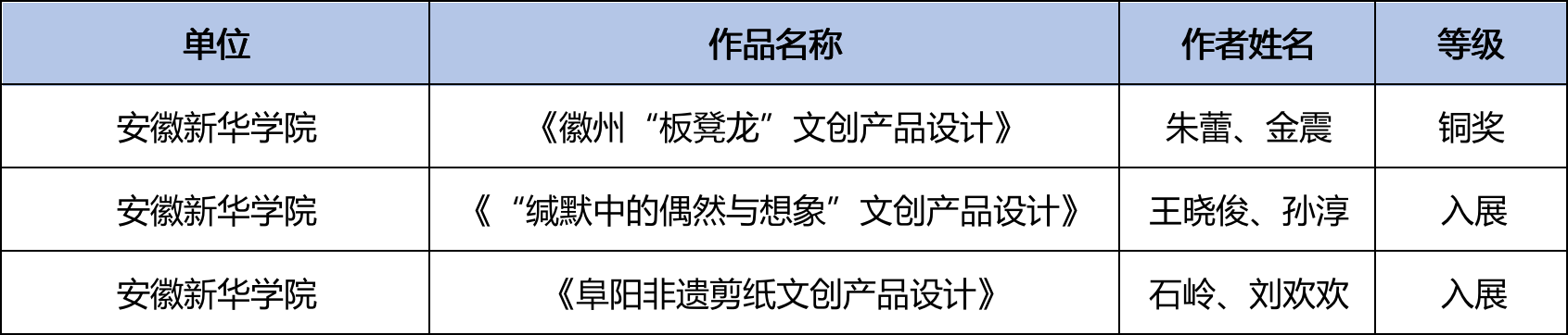 本网讯(通讯员:江河、朱蕾)由中国世界贸易组织研究会指导,中国国际投资促进会等单位支持,中国对外贸易经济合作企业协会等多家单位共同举办的2023文化贸易投融资博览会(简称文贸会),日前在合肥滨湖国际会展中心正式启幕。博览会期间,由中国工艺美术学会主办,安徽省工艺美术学会与中设国际会展集团承办的“当代工艺美术展”及“2023工艺美术创新设计作品大赛”同时进行。经中国工艺美术学会聘请国家级知名工艺美术大师组成的评委会严格评选,beat365官网选送的三组师生合作文创产品设计全部入选,其中艺术学院教师朱蕾、学生金震合作的《徽州板凳龙文创产品设计》荣获铜奖,王晓俊老师、学生孙淳合作的《缄默中的偶然与想象文创产品设计》、石岭老师、学生刘欢欢合作的《阜阳非遗剪纸文创产品设计》评为入展作品。