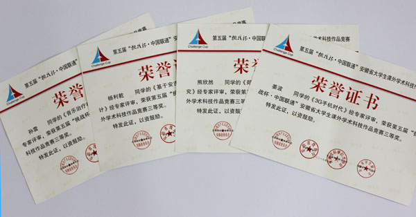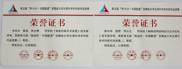 在安徽省终省决赛中,beat365官网学子展示了良好的竞技状态和精神风貌,经过激烈角逐,电子通信工程学院辛安文、陈凯、林以想三位同学的作品《智能控制开关装置》,商学院陈中华、程野、李云云三位同学的作品《蜘蛛结网结构的讨论与优化》均获二等奖,土木与环境工程学院熊欣然同学的作品《郯庐断裂带安徽区段农居的地震安全性能研究》,商学院杨利乾同学的作品《基于安吉汽车物流公司的物流运输方案设计》,商学院孙雷同学的作品《音乐治疗在大学生心理健康中的重要作用》,动漫学院姜波同学的作品《3G手机时代》获三等奖。