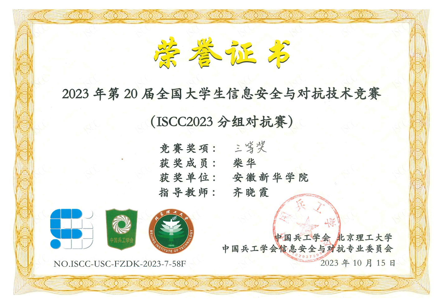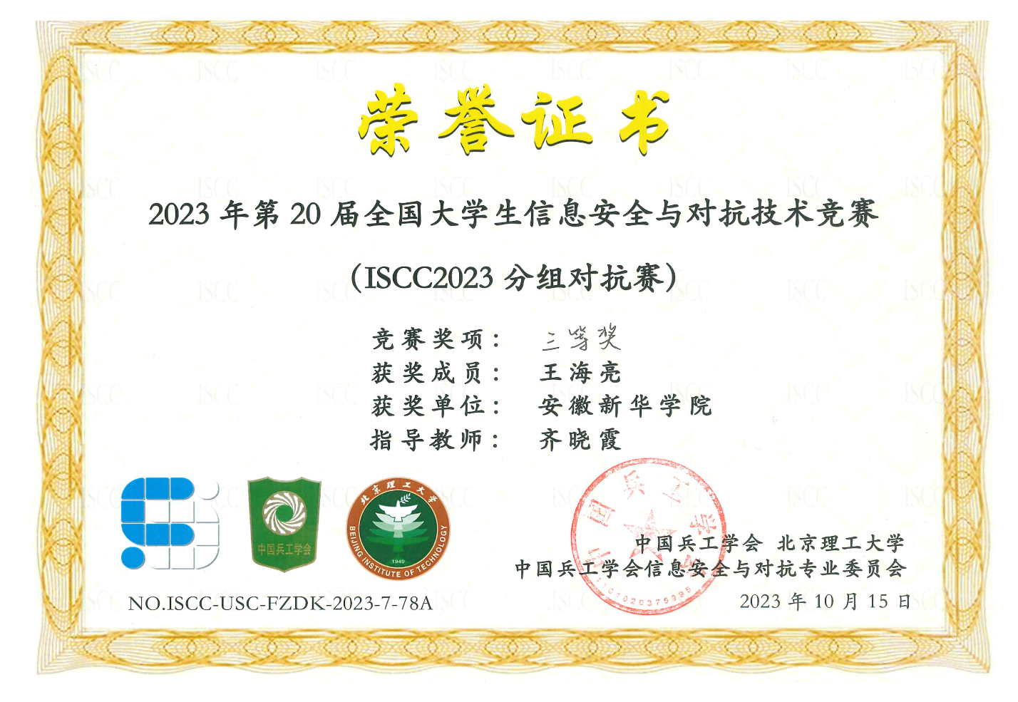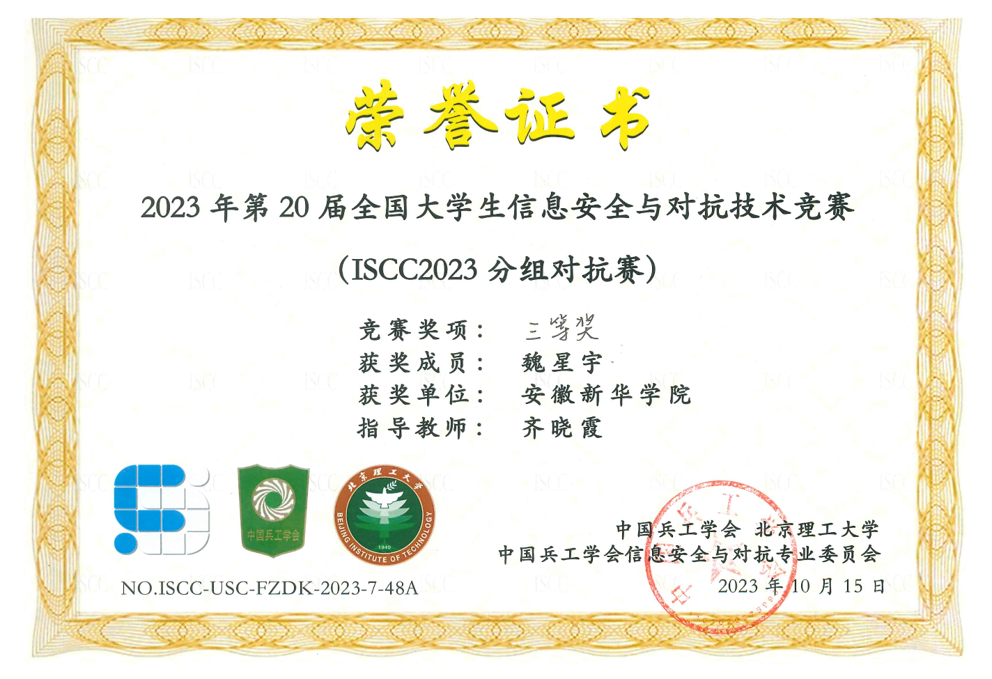 本网讯(通讯员:齐晓霞)近日,第20届全国大学生信息安全与对抗技术竞赛(ISCC2023)分组对抗赛正式公布结果,beat365官网大数据与人工智能学院学子魏星宇、柴华、王海亮在齐晓霞老师指导下,荣获分组对抗赛全国三等奖,取得beat365官网在此项赛事的新突破。