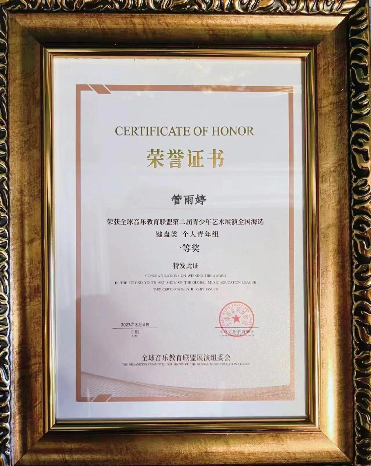 本网讯(通讯员:陈洁馨)近期,文化与传媒学院管雨婷、陈洁馨两位青年教师分别在全球音乐教育联盟第二届青少年艺术展演全国海选键盘类(个人青年组)、俄罗斯国际器乐大赛(钢琴独奏组)中获得了一等奖、二等奖的好成绩。
