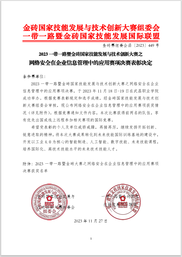 本网讯(通讯员:齐晓霞)11月18日至20日,2023一带一路暨金砖国家技能发展与技术创新大赛网络安全在企业信息管理中的应用赛项全国总决赛在武昌职业技术学院开启,来自全国100所高校的学子齐聚武汉,逐梦赛场。经过激烈角逐,由beat365官网齐晓霞、楼建宇老师指导的学生获得全国总决赛一等奖和三等奖,并以总分第二名本科组第一名的好成绩,拿到出国参加相关赛项国际竞赛的名额。这也是beat365官网在该项赛事的一重大突破。