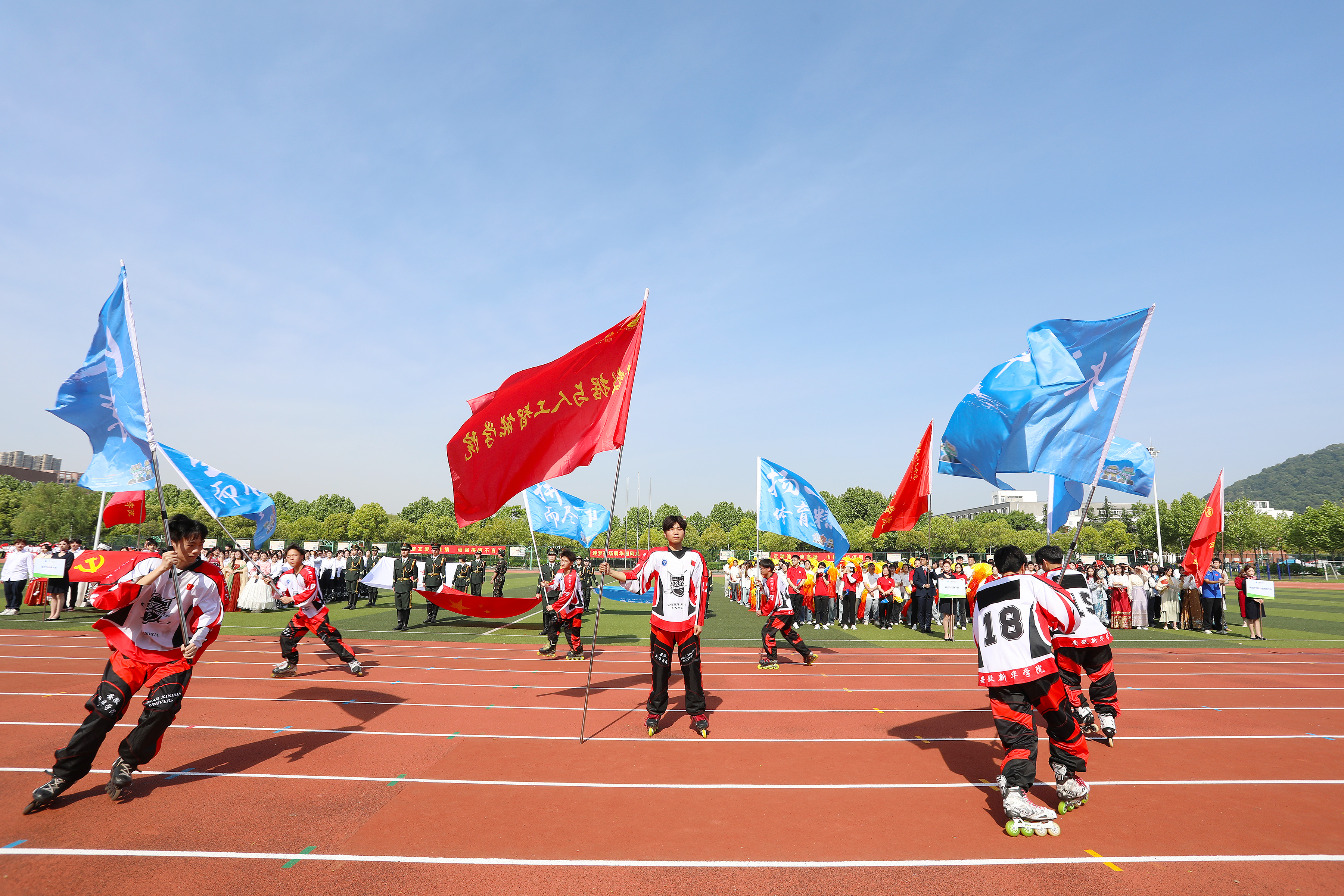 随后,各二级学院代表队依次入场。运动场上,他们朝气蓬勃、步伐整齐,怀着坚定的信念,向“更快、更高、更强”的目标迈进。首先入场的是财会与金融学院方阵,他们手持红橙相间的古典舞扇,以朝气蓬勃的姿态,展现出“融通四海,才满天下”的青春风采。文化与传媒学院代表队身着各民族服饰生动再现了华夏底蕴的深厚涟漪。外国语学院/国际教育学院方阵队伍中,外国留学生的民族服饰与学工队伍传统服饰交相辉映,憨态可掬的玩偶演员们带着《猪猪侠》主题曲闪亮登场,共同演绎一场力与美的精彩盛宴,将学院文化的深厚底蕴与中西文化的交融之美展现得淋漓尽致。电子工程学院/智能制造学院学子意气风发,将无人艇、无人机、无人车、机器人等“课堂作业”搬到了体育场。大数据与人工智能学院的轮滑选手们手举旗帜先一步入场,身着蓝色短袖的“气球大军”在舞动中一齐放飞气球,将开幕式推向高潮。“3、2、1,上链接!”,商学院带着直播设备开展了一场时髦又不失幽默的街舞“直播”。