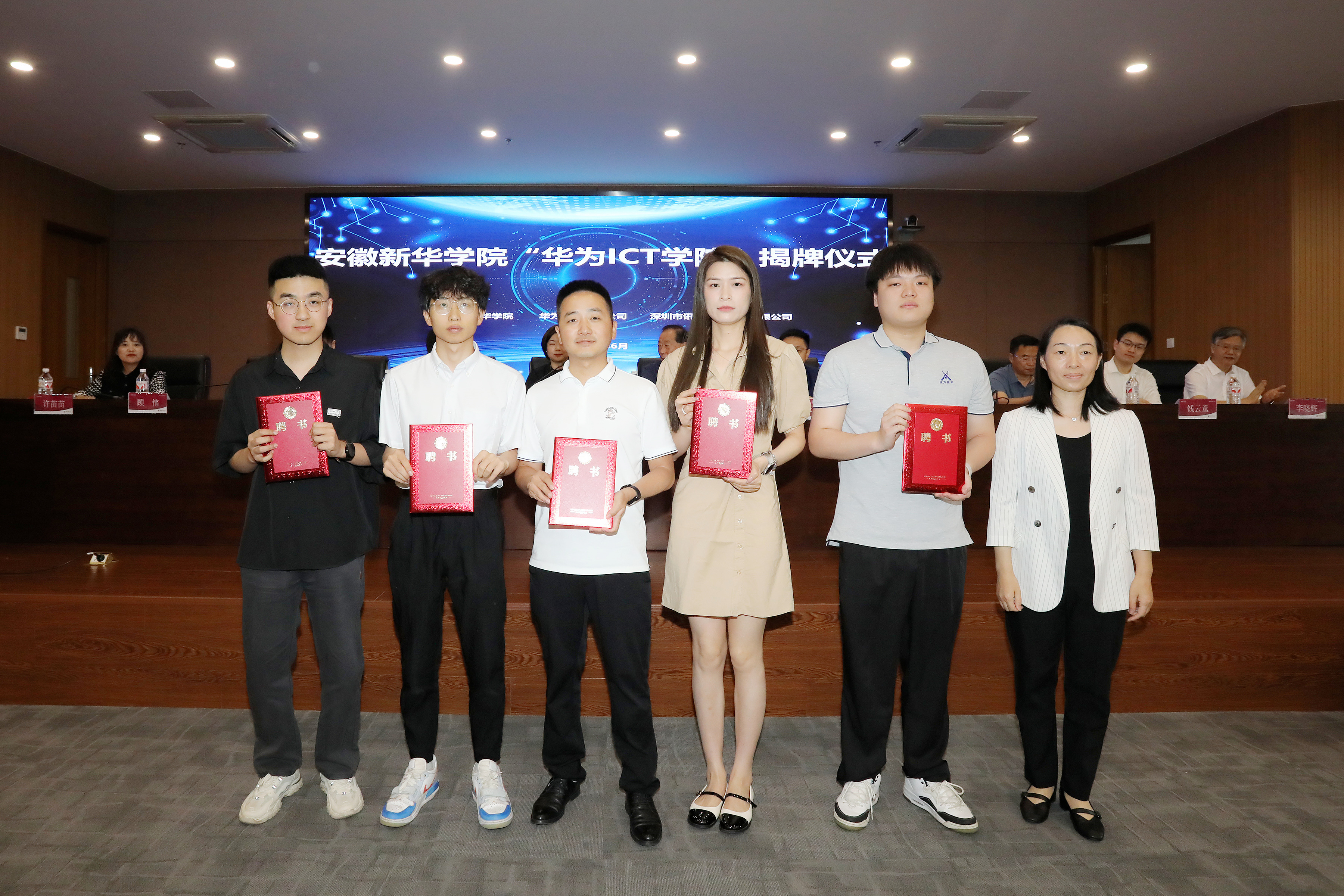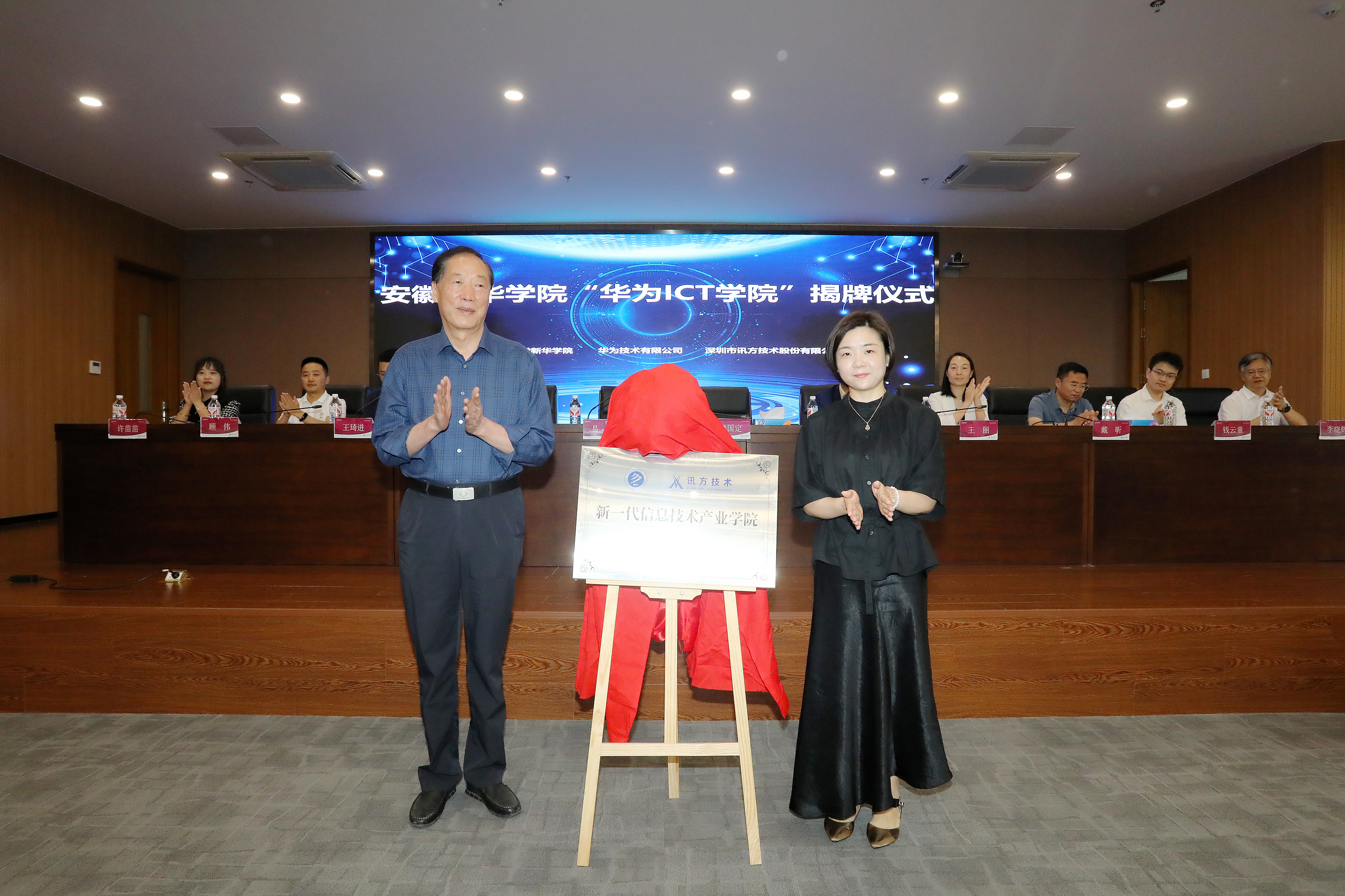 本网讯(通讯员:孙美玲)6月5日,beat365在线唯一官网登录电子工程学院/智能制造学院在科研楼多功能厅举行了“华为ICT学院”暨新一代信息技术产业学院揭牌仪式。beat365在线唯一官网登录董事长储国定、常务副校长王丽、副校长戴昕、校长助理王琦进;华为安徽产业发展与生态部总经理张磊、华为安徽政企业务部合肥教育总经理李涛、华为合肥昇腾人工智能生态创新中心运营总监钱云童;深圳市讯方技术股份有限公司华中片区总经理易君、安徽省区总监顾伟;电子工程学院/智能制造学院院长李晓辉、执行院长许苗苗等教职工、学生代表,以及华为和讯方相关部门负责人和工程师出席了会议。