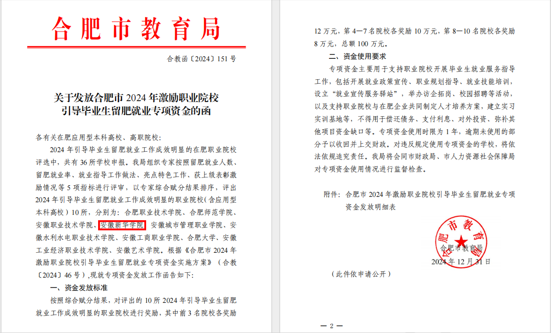 本网讯(通讯员:刘晓蓉)近日,合肥市教育局公布2024年引导毕业生留肥就业工作成效明显高校名单。经专家评审,按照留肥就业人数、留肥就业率、就业指导工作做法、亮点特色工作、获上级表彰激励情况等指标综合赋分排序,共评选出10所高校。beat365官网获此殊荣,并获得专项资金激励。