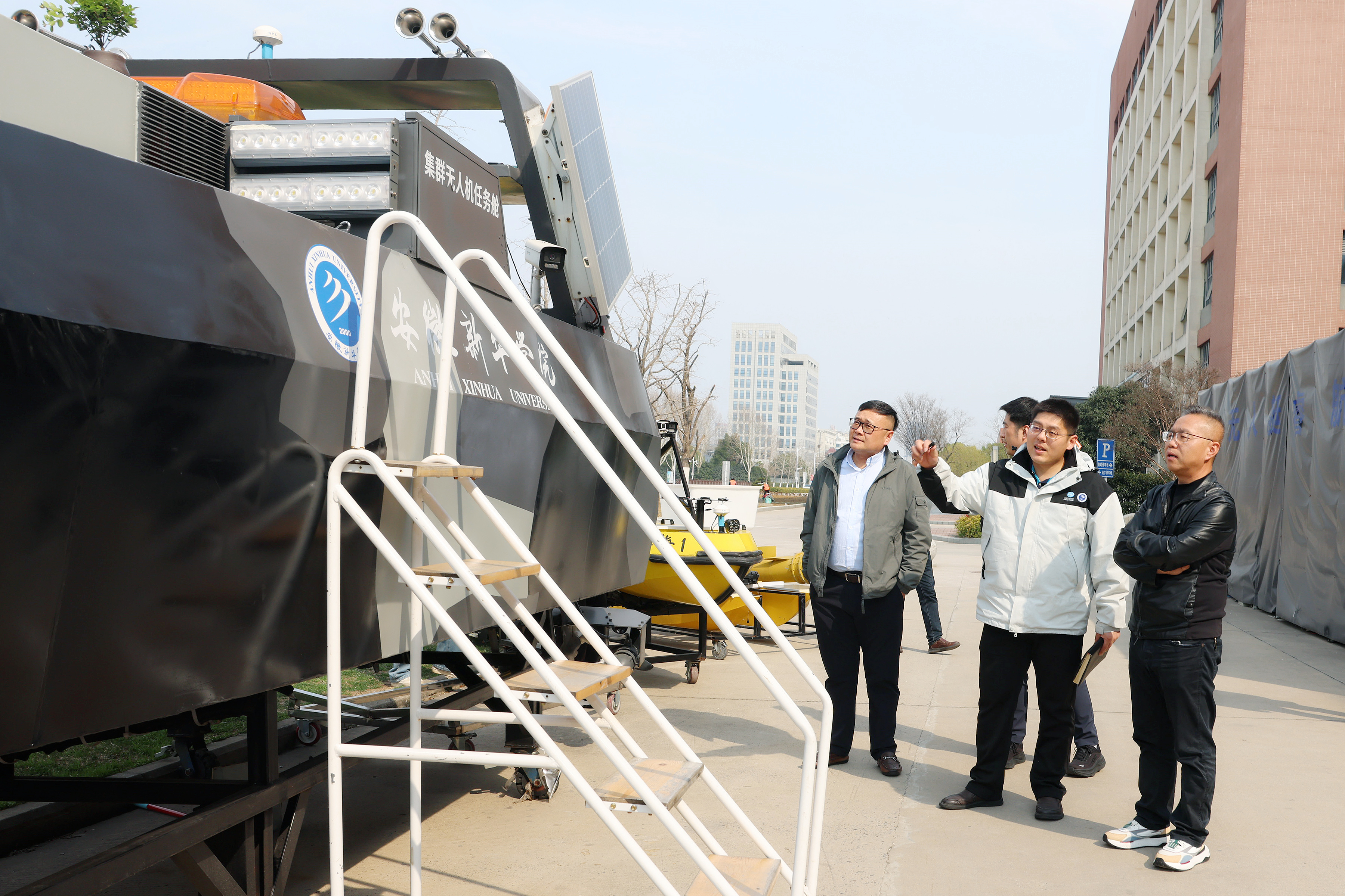 张明首先前往睿航无人艇团队室外作业车间及相关实验室进行实地考察。在室外作业车间,团队负责人刘源详细介绍了团队现阶段研发的无人艇装备主要功能及应用场景,展示了学校研发的各类无人艇在复杂水域环境下的稳定性能与精准作业能力。调研过程中,张明认真查看了各类研发设备,并与刘源就无人艇的应用场景、研发难点及创新点进行了深入交流,全面了解了团队从技术研发到产品雏形构建的全过程。