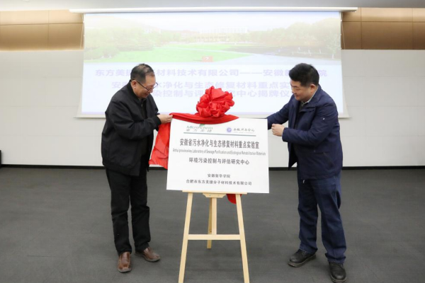 最后,朱守诚董事长与赵良庆校长一起为“安徽省污水净化与生态修复材料重点实验室-环境污染控制与评价研究中心”揭牌。