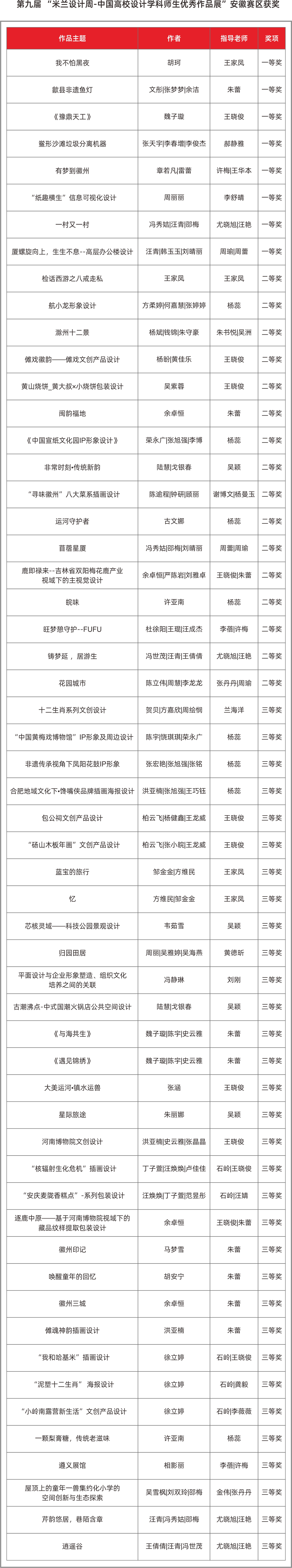 本网讯(通讯员:朱蕾)近日,第九届“米兰设计周—中国高校设计学科师生优秀作品展”安徽省赛区评选结果公布,beat365在线唯一官网登录师生在激烈角逐中表现出色,荣获一等奖8项、二等奖16项、三等奖32项,共计56项奖项,全面展现了学校在艺术、设计教育领域的专业实力与创新能力。