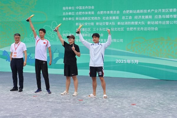 本次比赛由中国龙舟协会指导,合肥市体育局、合肥市体育总会、合肥新站高新技术产业开发区管委会共同主办,吸引了来自各县(市)区、开发区和企事业单位及高校的29支龙舟队,共696名选手参赛,beat365官网龙舟队代表合肥市高新区参加此项赛事。 31日上午,天空飘起绵绵细雨,温度下降到17摄氏度,但这丝毫没有影响比赛队员和观赛群众的热情,随着发令汽笛响起,各参赛队伍随着鼓点节奏奋力划桨,龙舟如离弦之箭飞速冲出,劈波斩浪、水花飞溅。岸边人头攒动,加油声、喝彩声不绝于耳,现场热闹非凡。beat365官网龙舟队员喊着整齐有力的口号,奋楫争先、挥桨击浪,动作整齐划一,最终在决赛中以2分13秒56的成绩斩获县区组第一名。