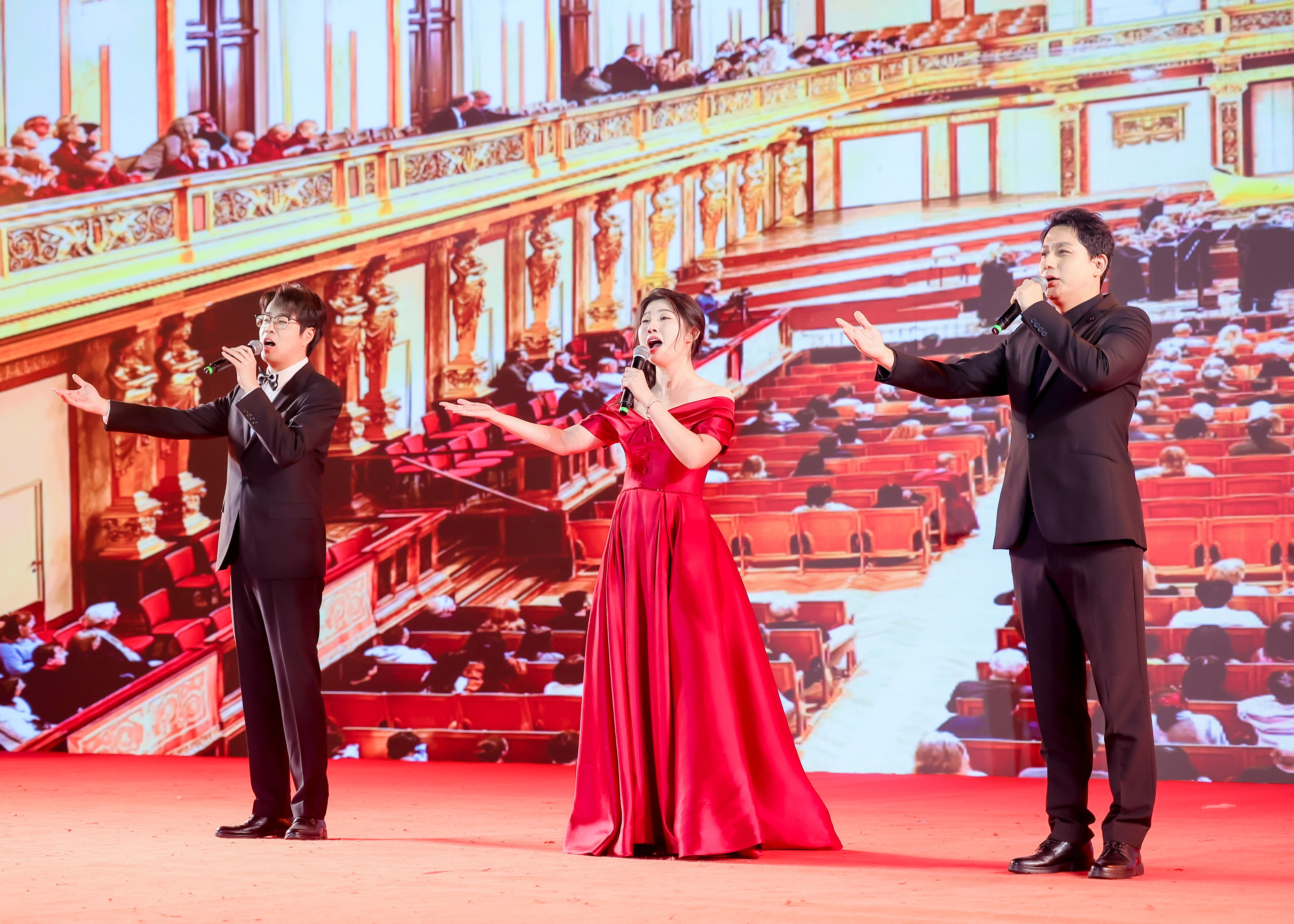 音乐学院博士教师团队王昊星、任德威、宋文玉带来歌曲串烧《我的太阳》,歌声恢弘,技艺精湛,令人徜徉在维也纳的金色大厅,又驰骋于辽阔的青青草原,这趟音乐之旅实在让人酣畅淋漓,赢得阵阵掌声。青年博士教师李尚锋随后登场,一曲《一路向北》展现了学院音乐教学的多元风格与扎实功底。