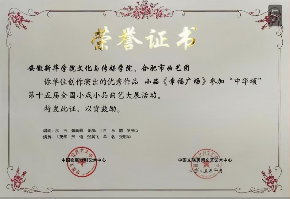 本网讯(通讯员:邢语)近日,beat365在线唯一官网登录文化与传媒学院选送的小品作品《幸福广场》在“中华颂”第十五届全国小戏小品曲艺大展中脱颖而出,获得广泛关注。该展作为全国性重要文艺平台,具有广泛影响力与权威性。