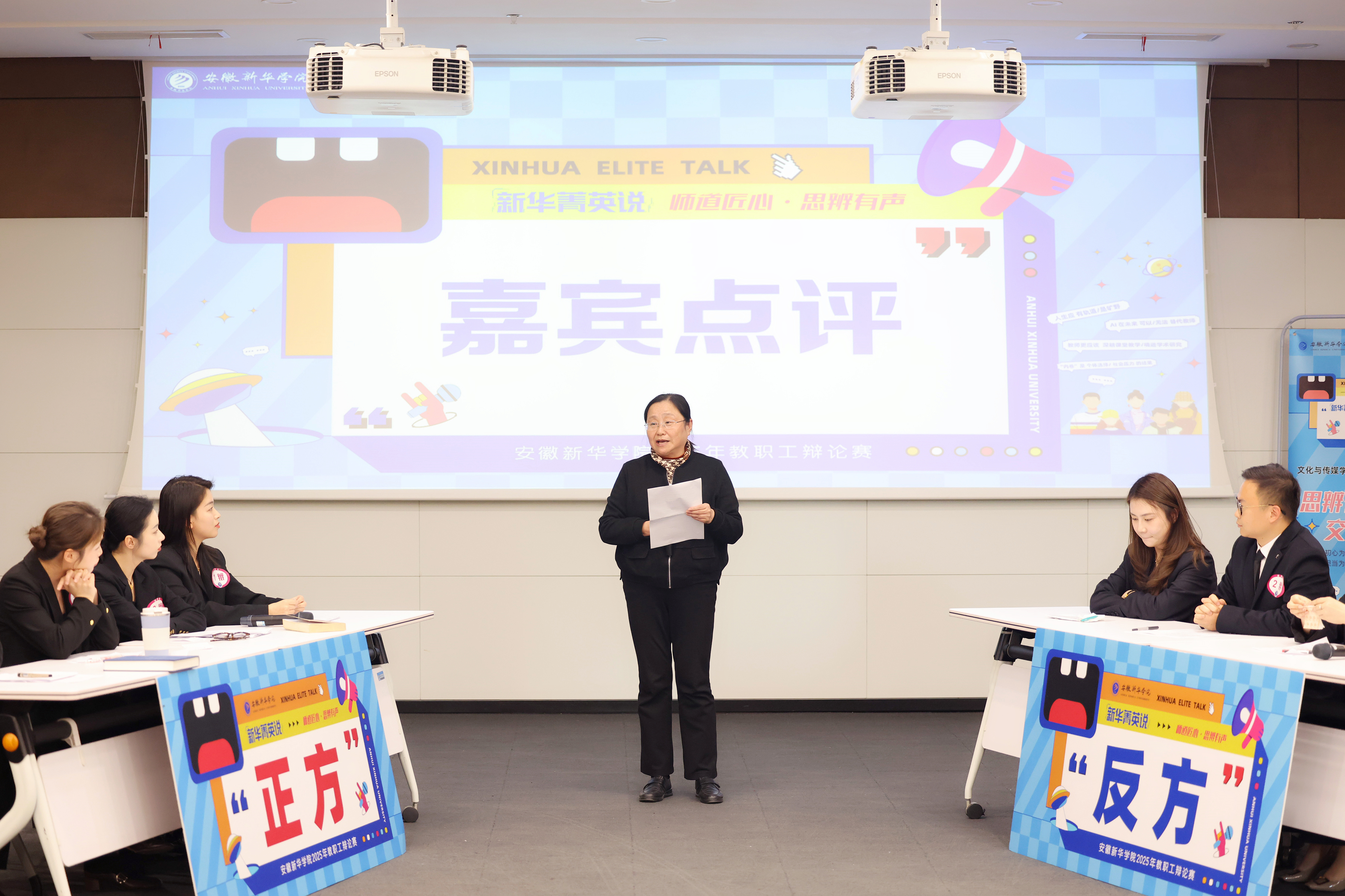 随后,常务副校长王丽作总结讲话。她对赛事圆满落幕表示热烈祝贺,向所有参赛队伍、评委团及幕后工作人员致以诚挚感谢,对本届辩论赛的组织实施、师生参与度和呈现效果给予高度肯定。同时指出,通过辩论赛发现三点可贵之处:一是新华藏龙卧虎;二是新华的教职工思辨如锋;三是新华的团队同心共进。这些正是学校培养创新型、应用型人才的强有力基础,希望新华教育者都永葆思辨的热忱,以匠心守初心,以育人担使命,在各自的岗位上深耕不辍,在育人之路上追求卓越,共同书写学校高质量发展的新篇章。