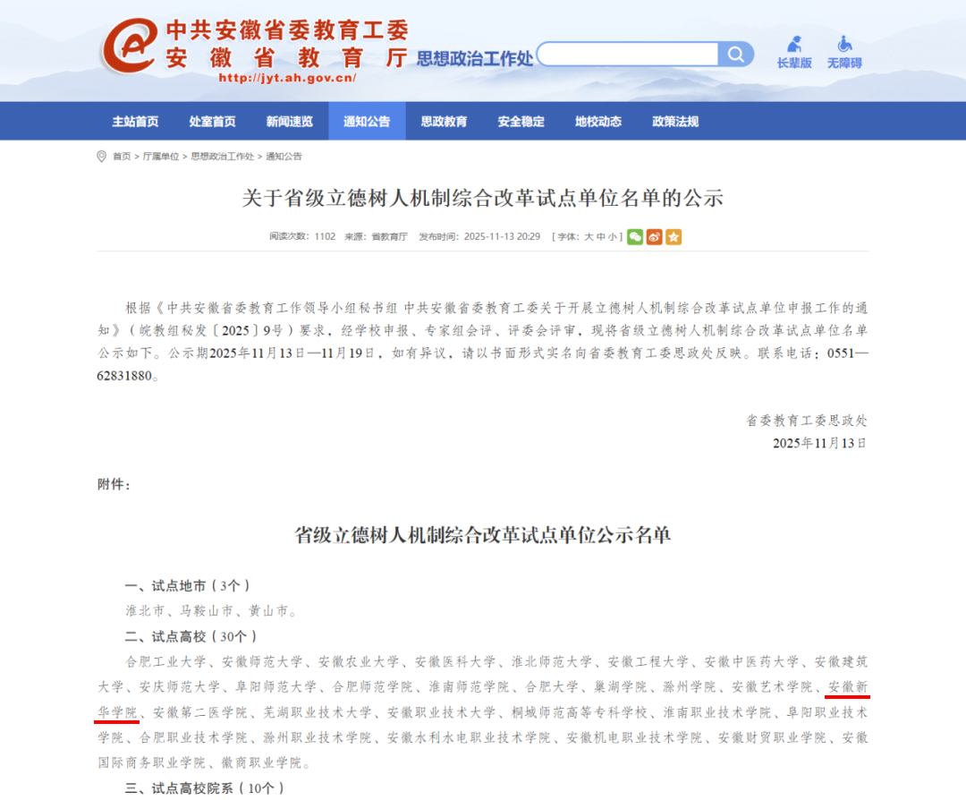 本网讯(通讯员:颜孟冉)近日,中共安徽省委教育工作领导小组秘书处、中共安徽省委教育工委联合发布省级立德树人机制综合改革试点单位名单,beat365官网成功入选省级立德树人机制综合改革试点高校。此次获批既是省教育主管部门对beat365官网长期以来坚持立德树人根本任务、创新育人模式成果的高度认可,更是beat365官网深入贯彻落实教育强国建设要求、推进人才培养质量提升的重要契机。