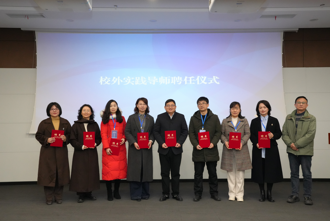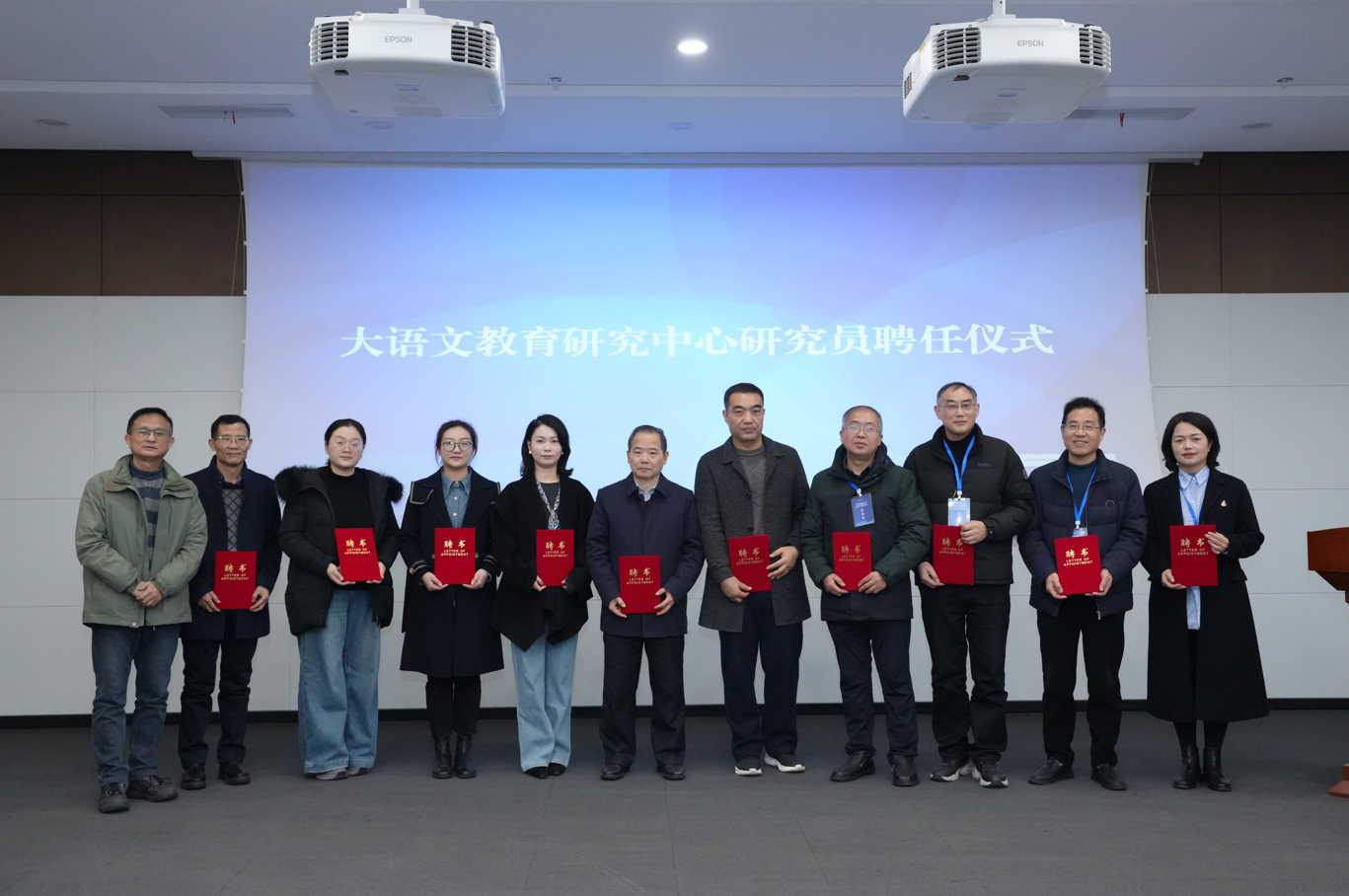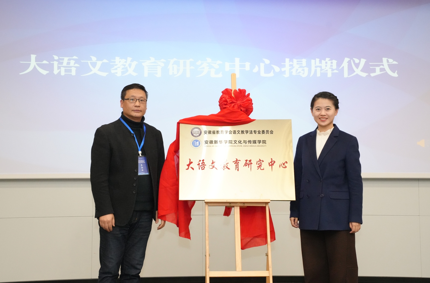 在揭牌与聘任仪式上,张寒生宣读了“大语文教育研究中心”成立及首批研究员聘任文件。洪玉与范小虎共同为中心揭牌,谢家顺为受聘研究员及校外实践导师颁发证书。